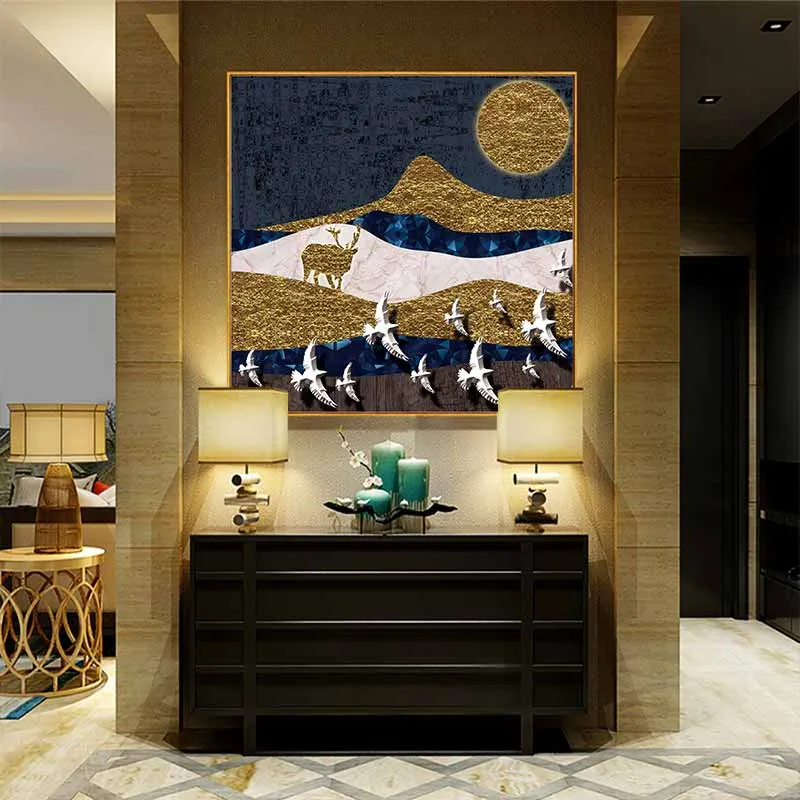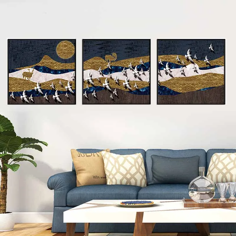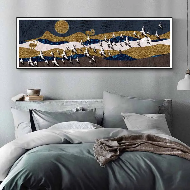 Tranh đàn chim và núi đồi vàng trừu tượng