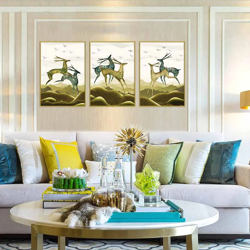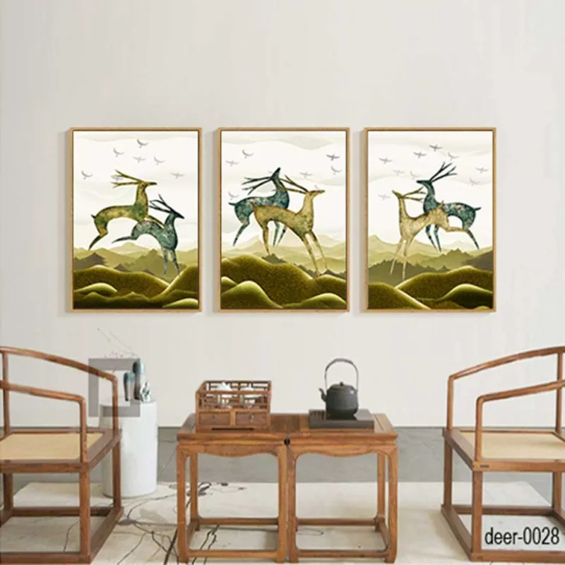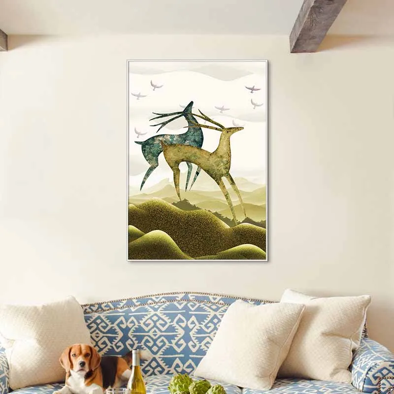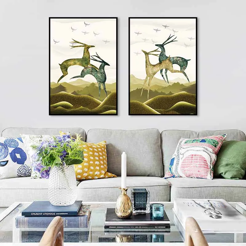 Tranh đàn nai cách điệu chạy nhảy trên đồi núi vàng trừu tượng