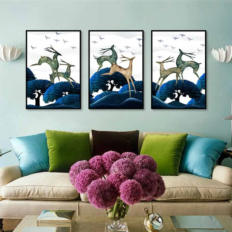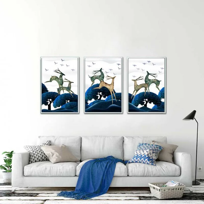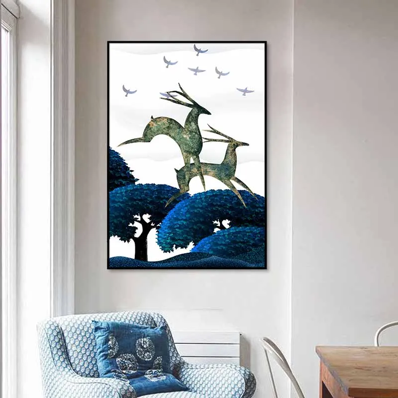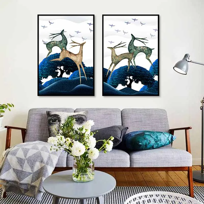 Tranh đàn nai cách điệu và chạy nhảy trền đồi núi trừu tượng