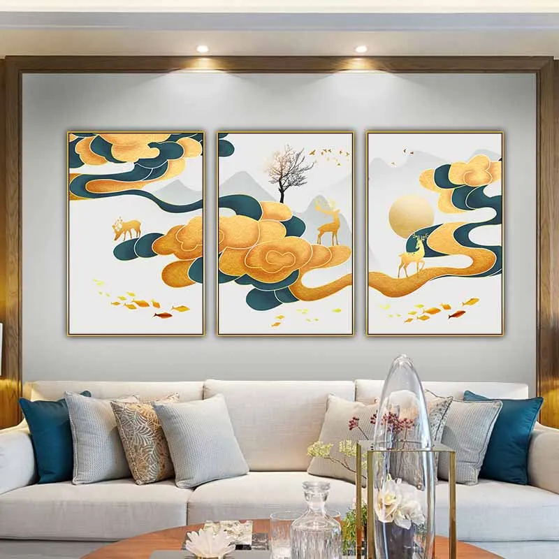 Tranh đàn nai cưỡi mây và đan cá bơi tung tăng phía dưới