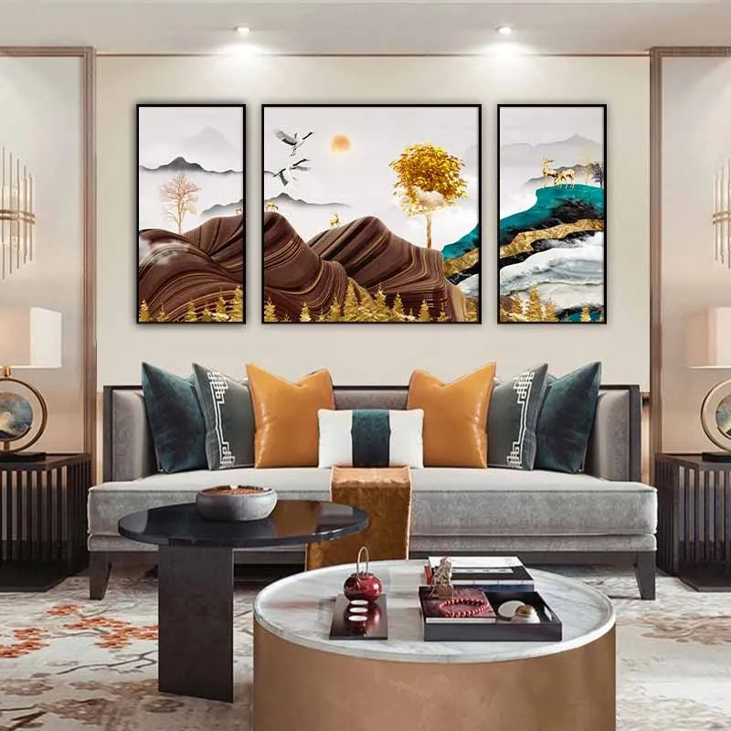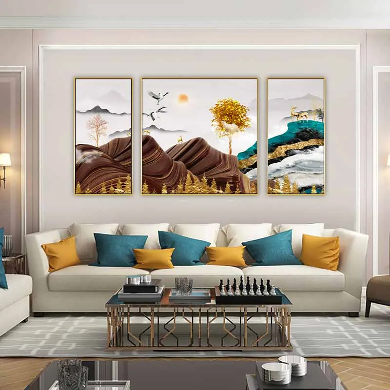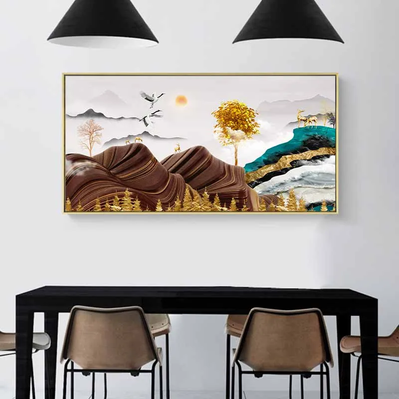 Tranh đàn nai đứng dưới tán cây lá vàng trên đỉnh đồi núi trừu tượng và đôi chim hạc