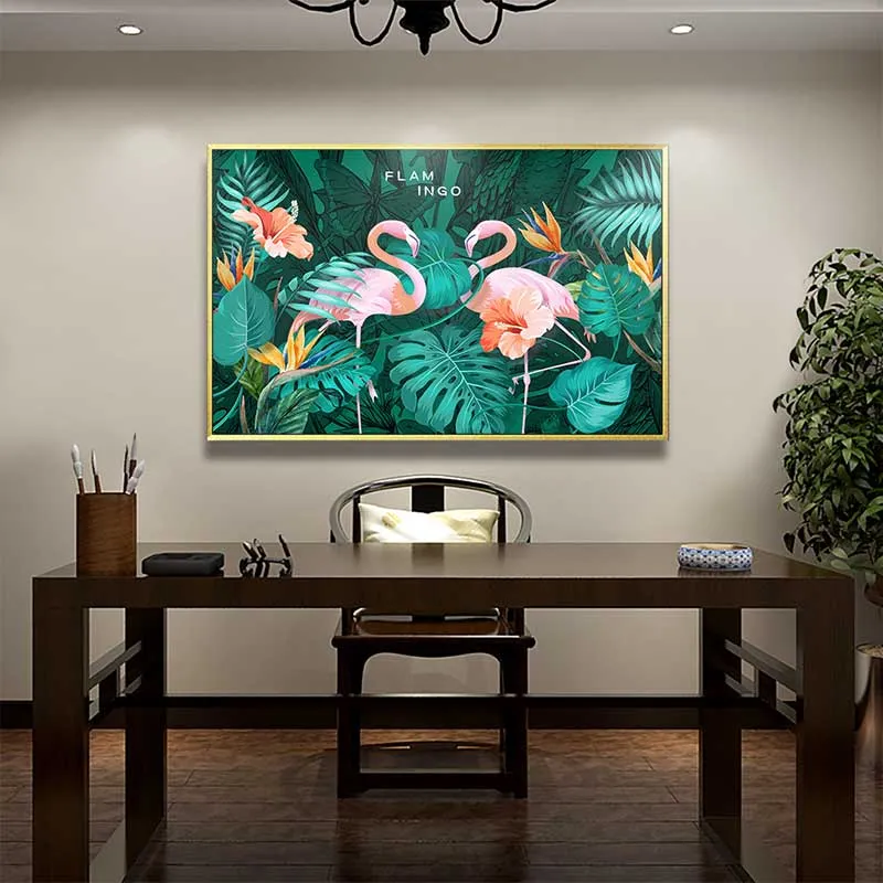 Bức tranh nghệ thuật đầy màu sắc này khắc họa hình ảnh đôi chim hồng hạc (flamingo) xinh đẹp giữa khung cảnh rừng cây nhiệt đới rực rỡ. Các chi tiết như lá cây nhiệt đới, hoa cúc vàng và những mảng màu xanh tươi mát tạo nên một không gian sống động và tràn đầy sức sống. Bức tranh mang phong cách hiện đại với sự kết hợp hài hòa giữa các gam màu nóng và lạnh, mang đến cảm giác tươi mới và năng lượng tích cực. Tác phẩm phù hợp để trang trí cho phòng khách, phòng làm việc hoặc bất kỳ không gian nào cần thêm điểm nhấn sinh động.