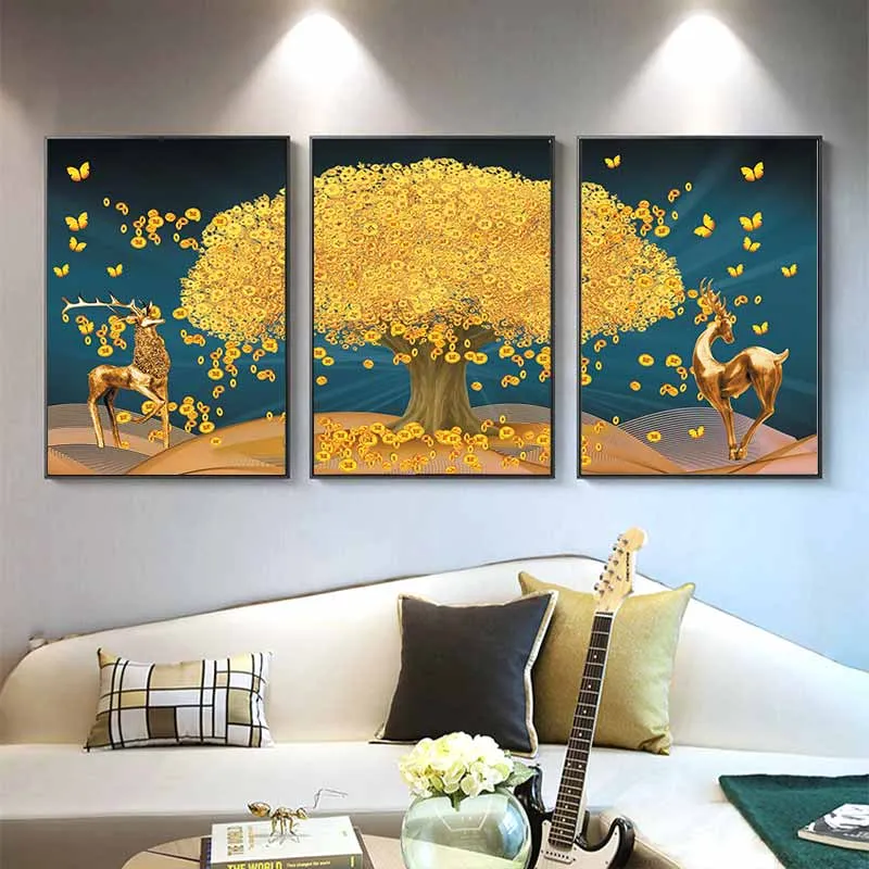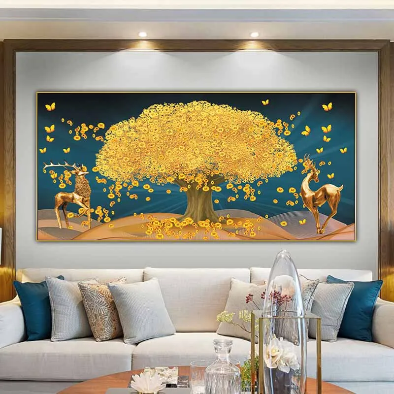 Tranh đôi nai và cây đồng tiền vàng tài lộc