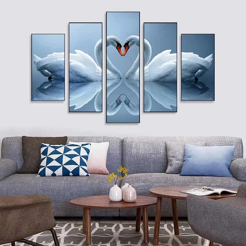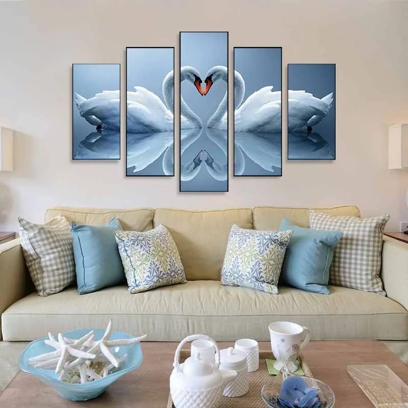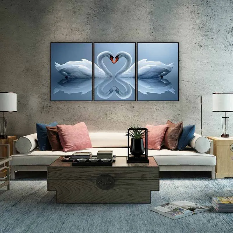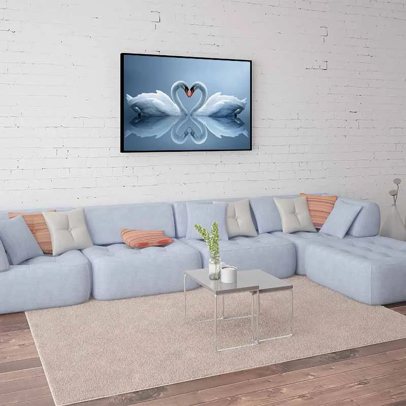 Tranh in canvas đôi thiên nga đang bơi trên mặt nước, chúng quay đầu vào nhau tạo thành 1 hình trái tim, mặt nước phẳng lặng tựa như một chiếc gương soi rõ từng chút một hình ảnh của đôi thiên nga xuống mặt nước.