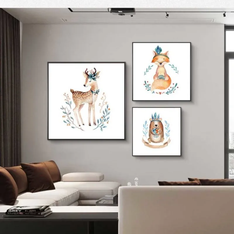 Tranh động vật gấu, hươu và cáo được vẽ theo kiểu truyện tranh