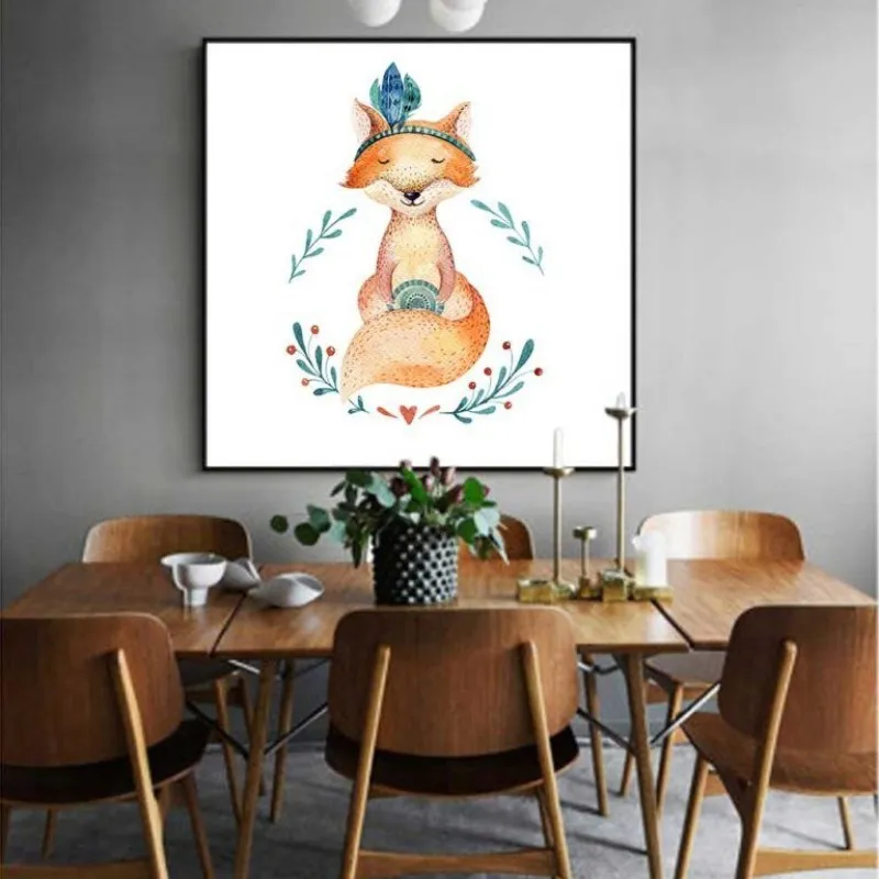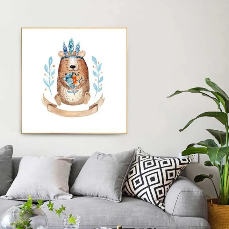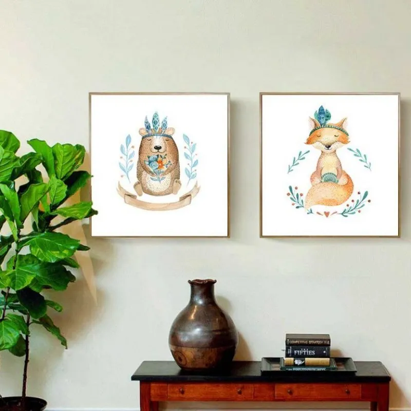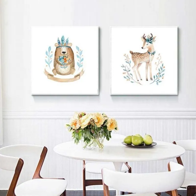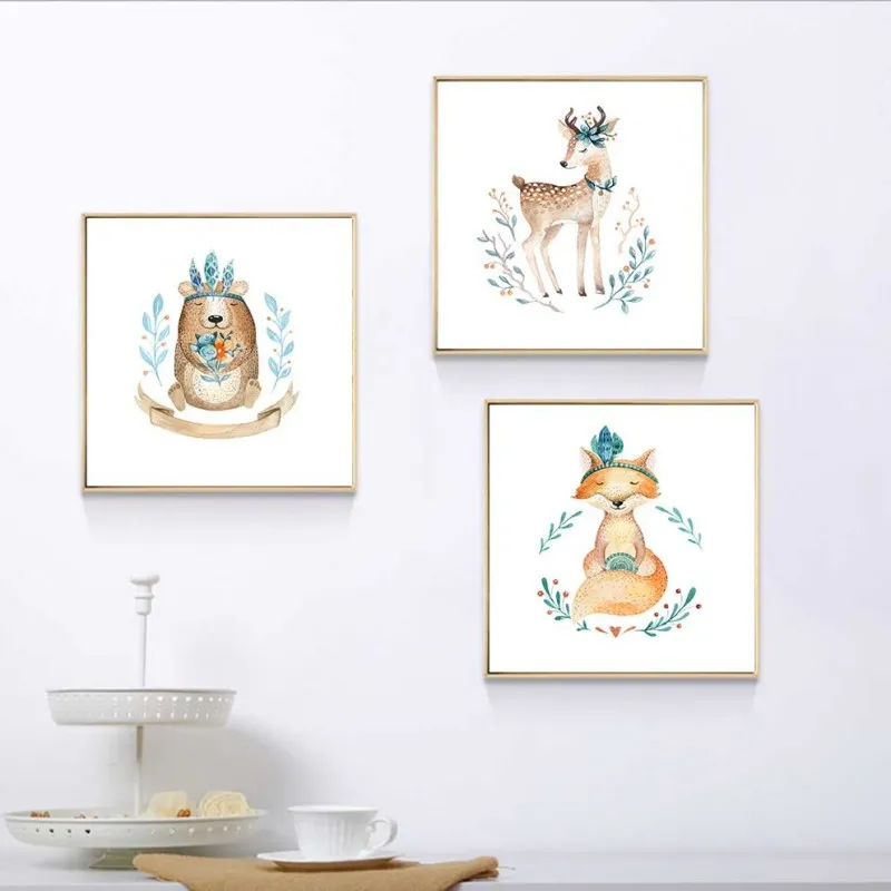 Tranh in canvas các loài động vật gấu con, hươu sao, và cáo, những con vật này xung quanh cơ thể là hoa và lá, những loài vật còn nhỏ vô cùng dễ thương.
