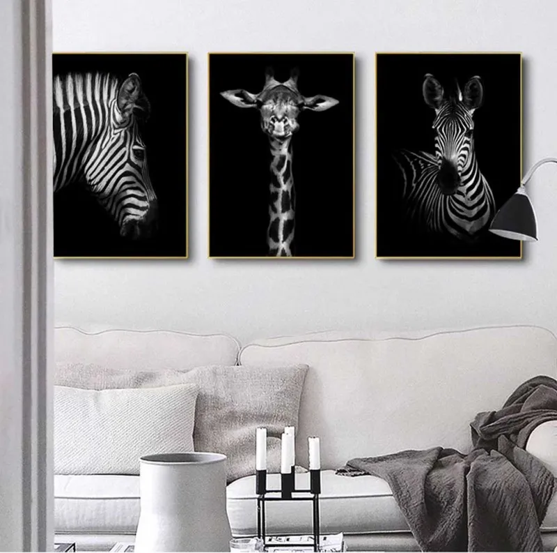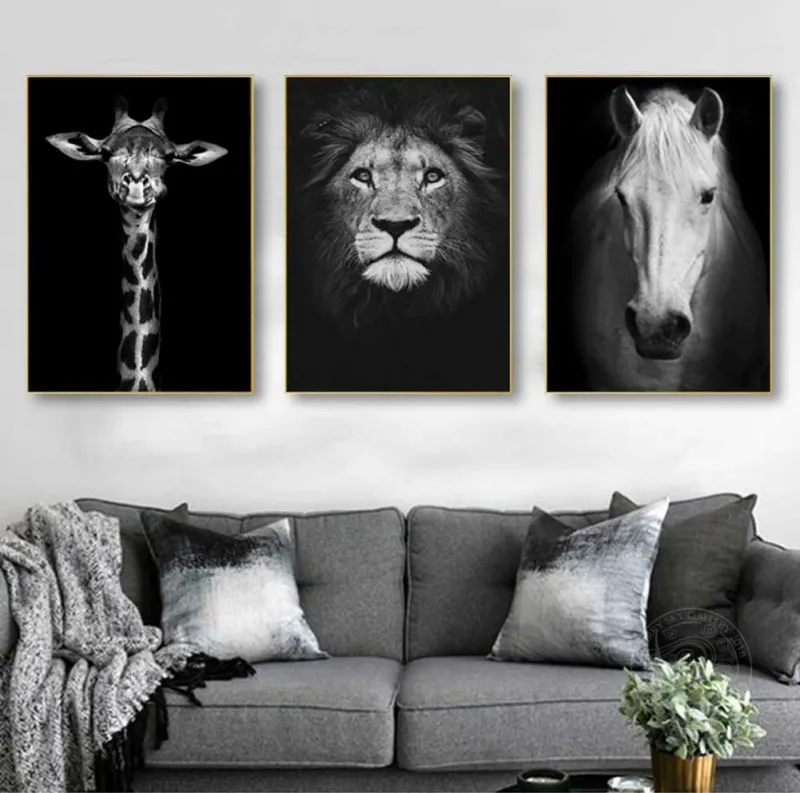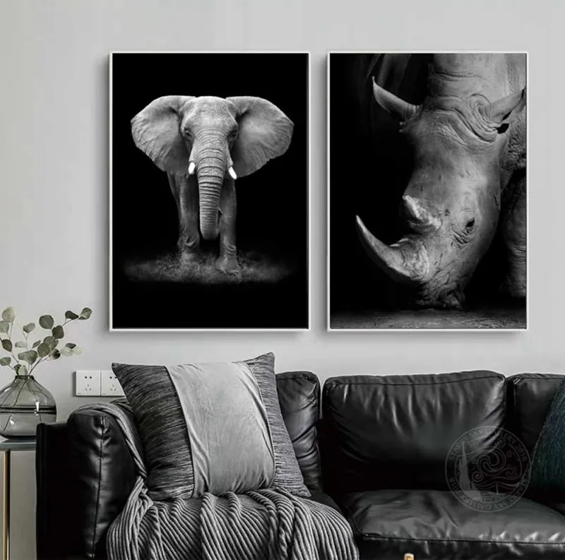 Tranh động vật hoang dã, voi, tê giác, hươu cao cổ, ngựa vằn, và sư tử, với tông màu chủ đạo trắng đen thích hợp treo trong phòng khách, thư viện, quá cà phê, chân cầu thang, tranh lẻ để ở bàn học, bàn làm việc,…