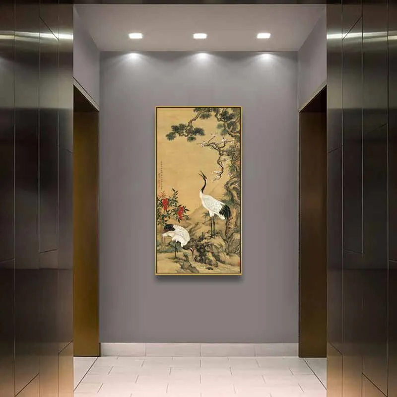 - Ánh sáng: Bức tranh với nhiều chi tiết và tông màu cần ánh sáng phù hợp. Ánh sáng chiếu điểm (spotlight) từ trần nhà hoặc đèn treo tường sẽ giúp làm nổi bật vẻ đẹp của tác phẩm, đặc biệt là các chi tiết của hạc và cây.