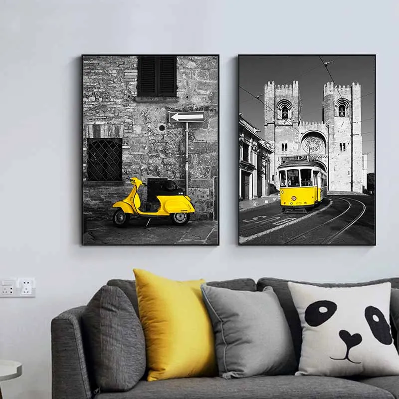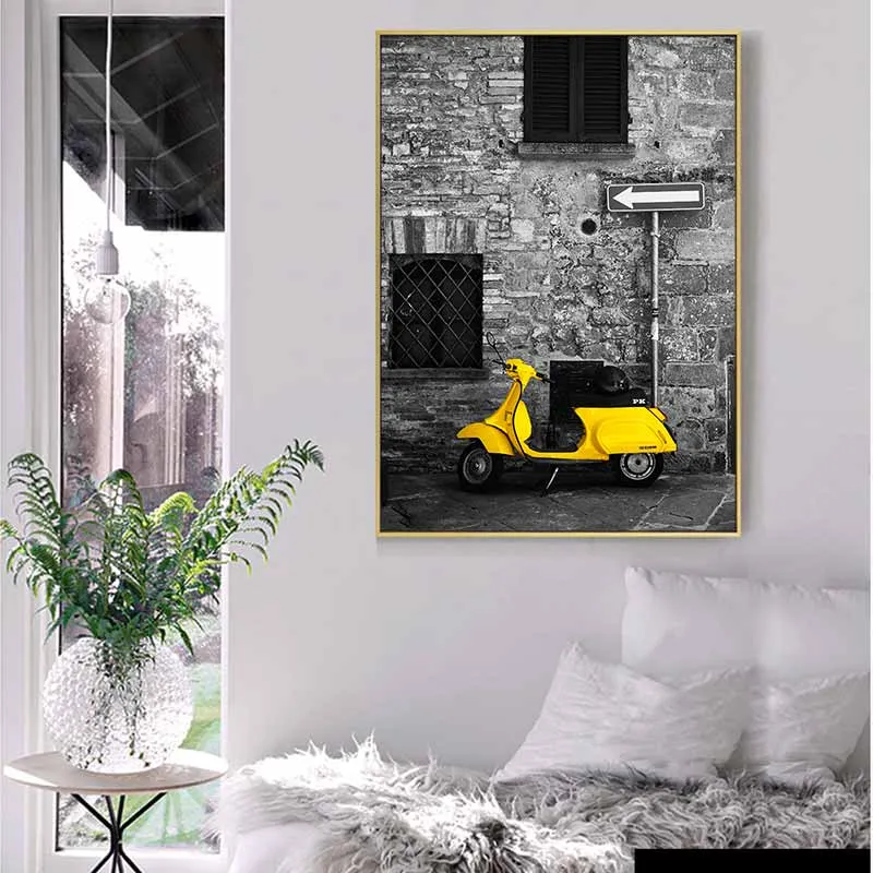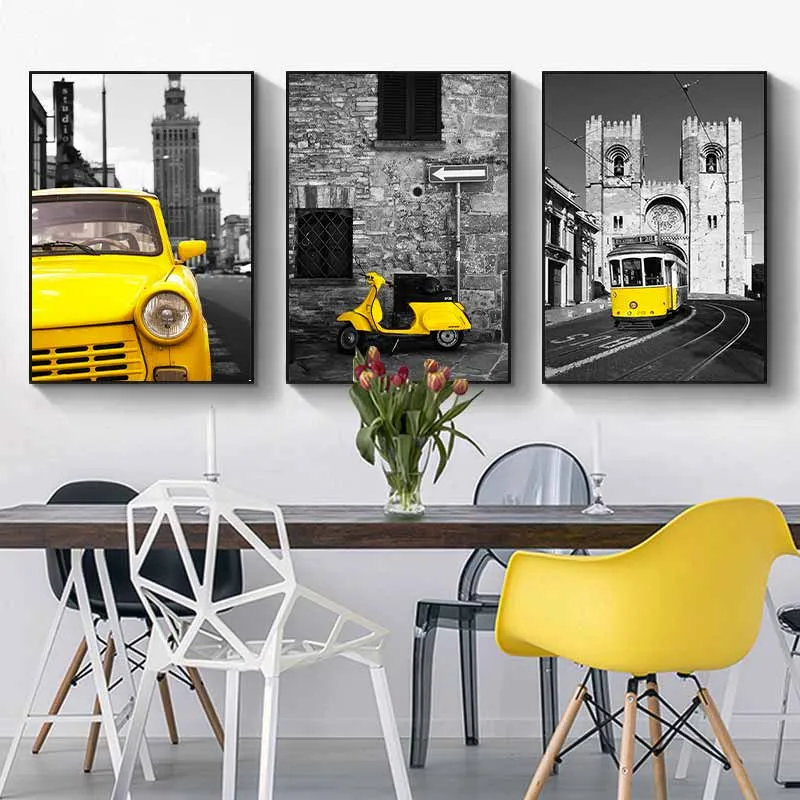 Tranh hiện đại scandinavian ô tô, vespa cổ, tàu hỏa màu vàng trên nền đen trắng