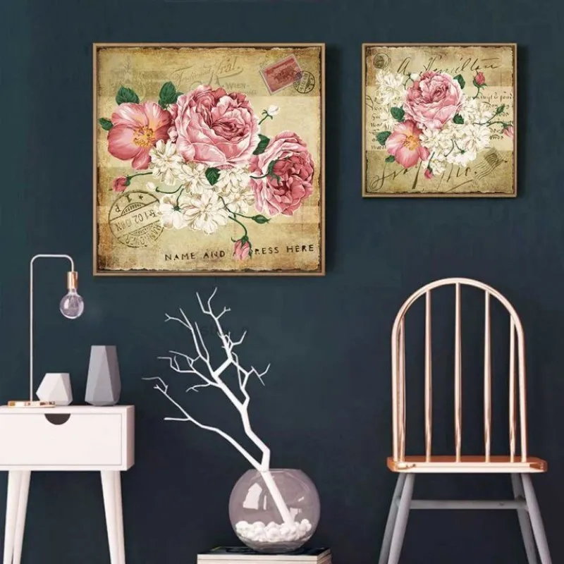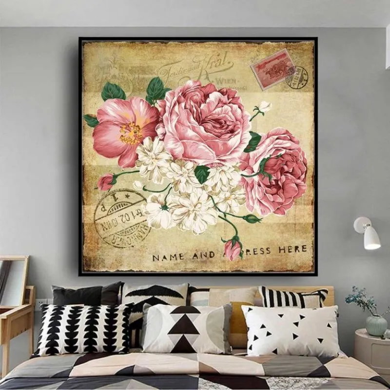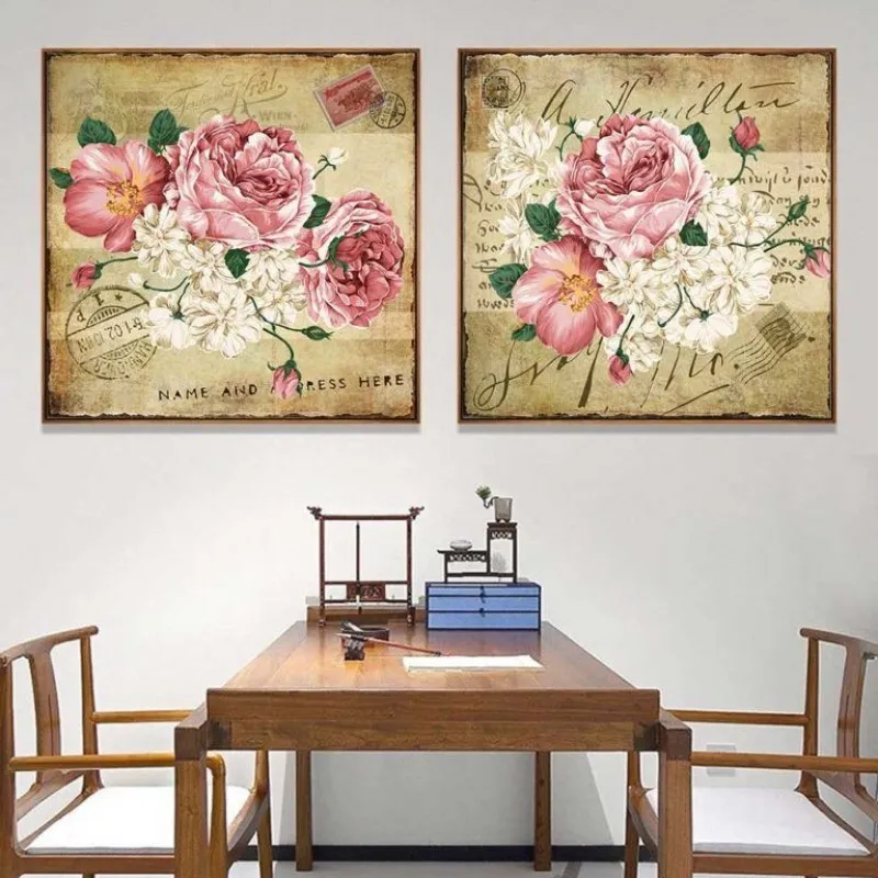 Tranh in canvas hoa mẫu đơn trên nền nâu có phong cách cổ điển, tranh có phong cách của các con tem cũ (Retro).