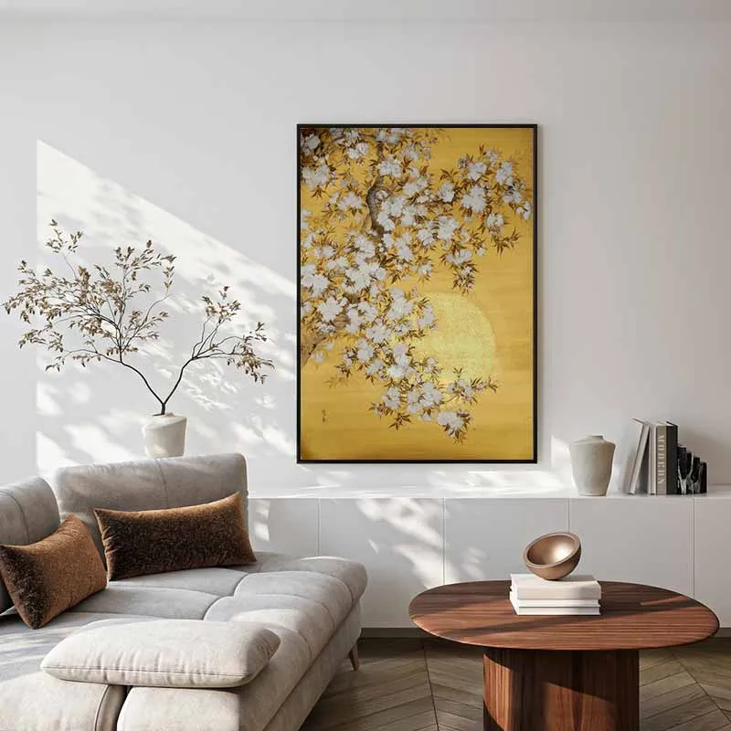 Bức tranh nghệ thuật này nổi bật với cành hoa anh đào (hoặc hoa mận) trắng muốt, tinh khôi nở rộ trên nền vàng kim rực rỡ, kết hợp với vầng trăng tròn dịu dàng. Với phong cách vẽ tinh xảo, sử dụng màu sắc tương phản mạnh mẽ nhưng hài hòa, bức tranh mang đậm nét truyền thống Á Đông (đặc biệt là Nhật Bản), gợi lên vẻ đẹp thanh khiết, sang trọng và ý nghĩa về sự tái sinh, thịnh vượng.