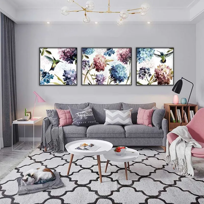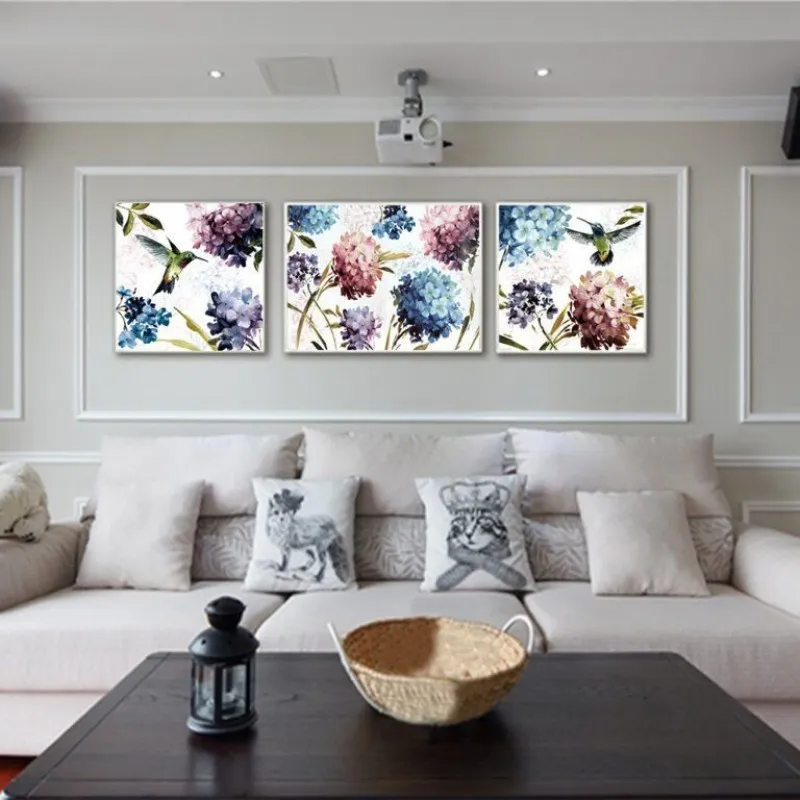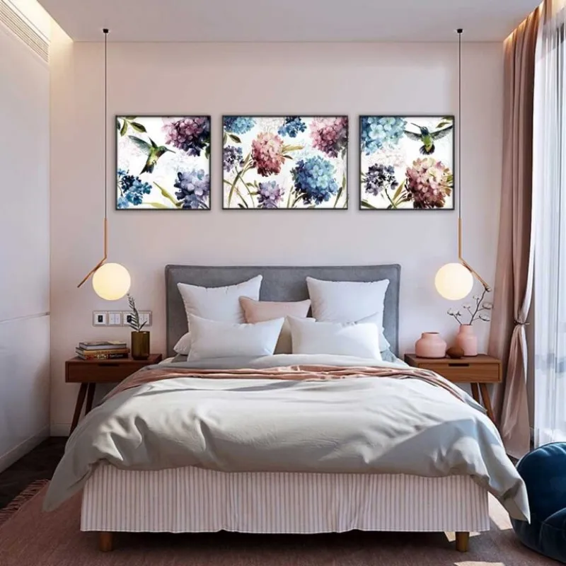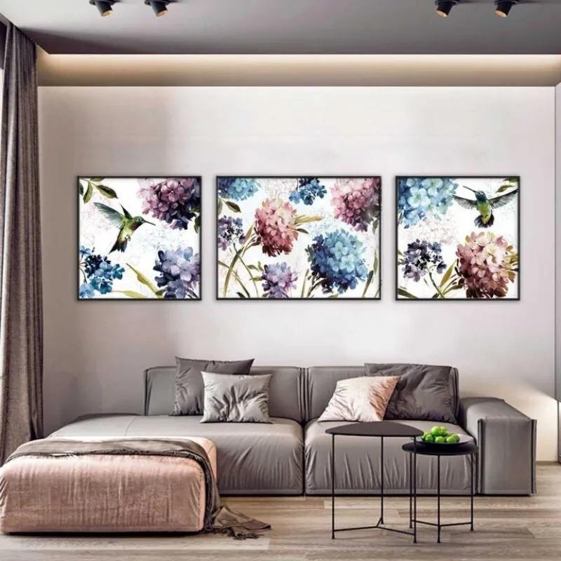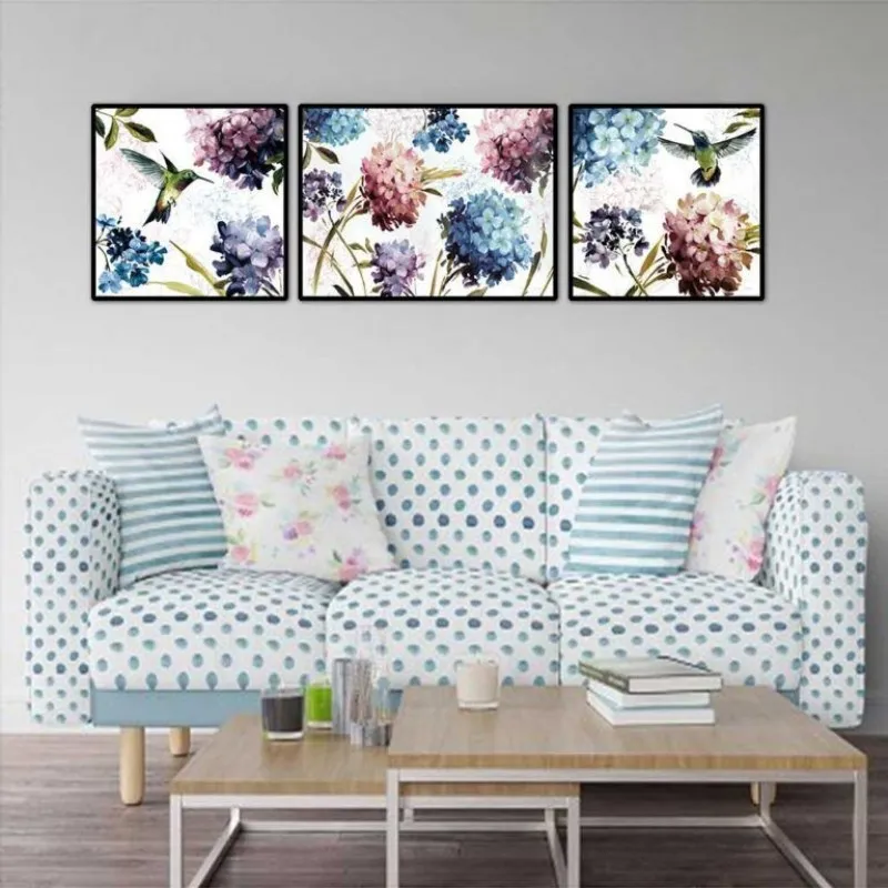Tranh in canvas hoa cẩm tú cầu và chim hút mật.