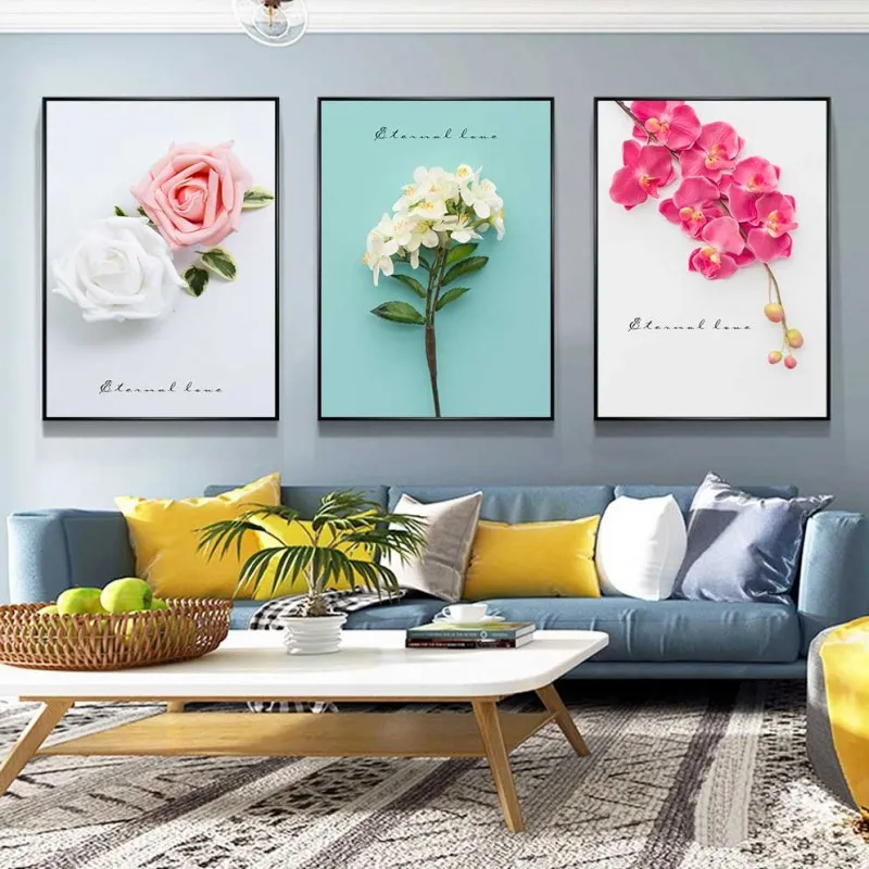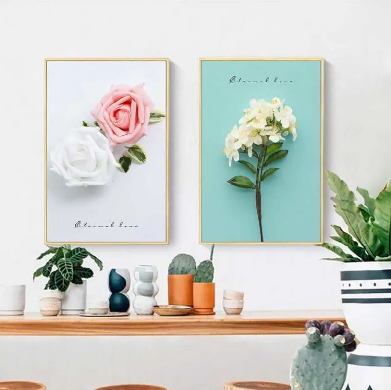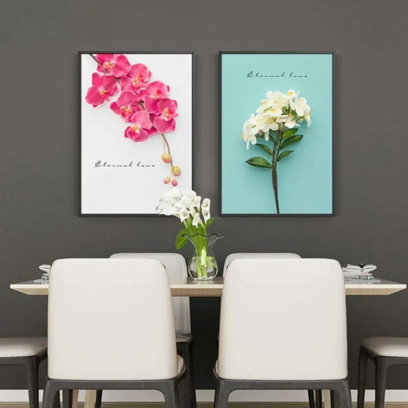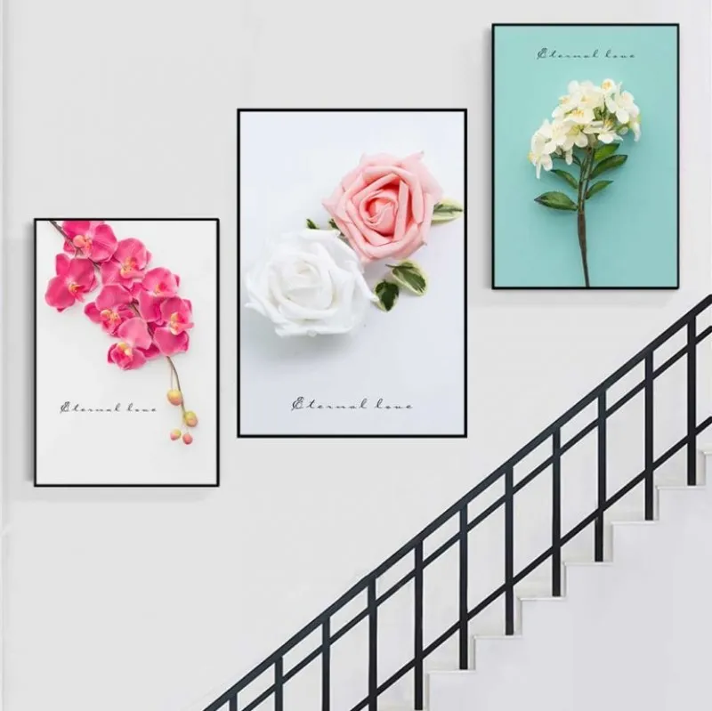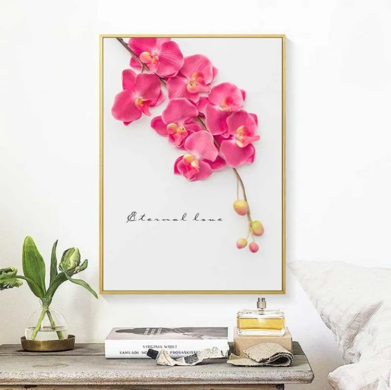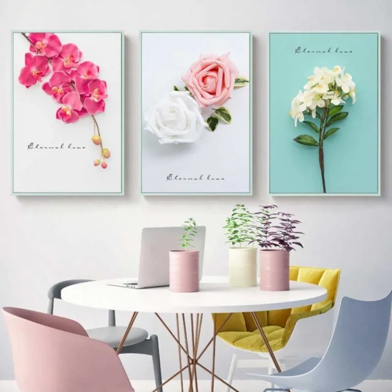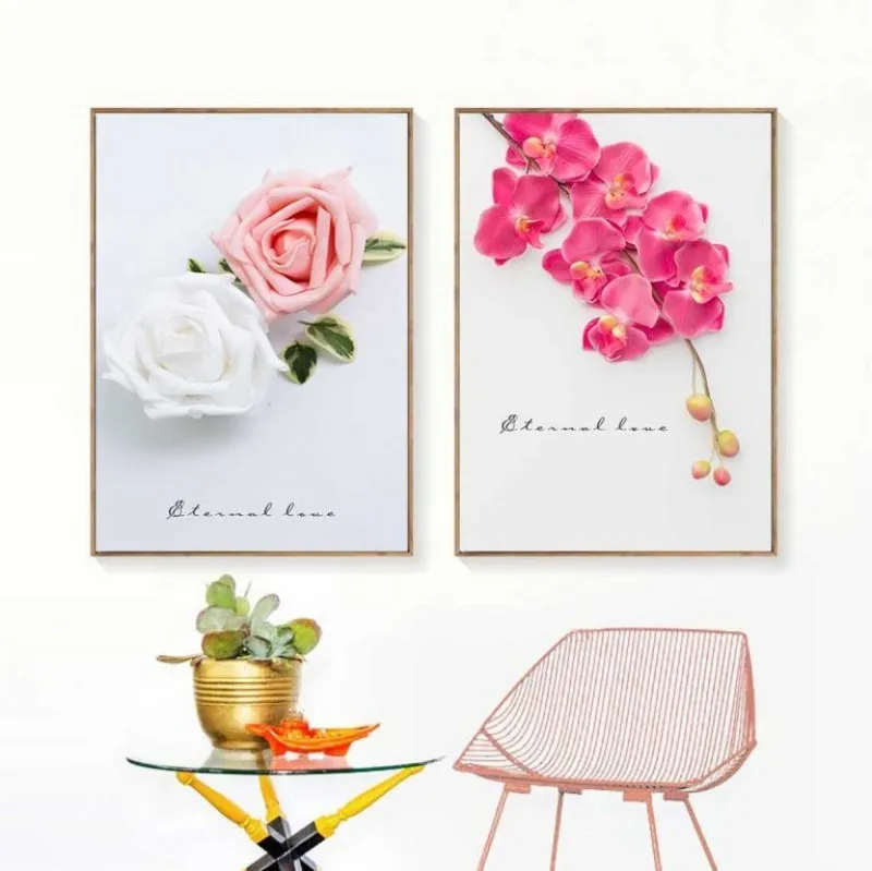 Tranh in canvas các loại hoa hoa hồng màu hồng và màu trắng, hoa lan hồng và hoa màu trắng.