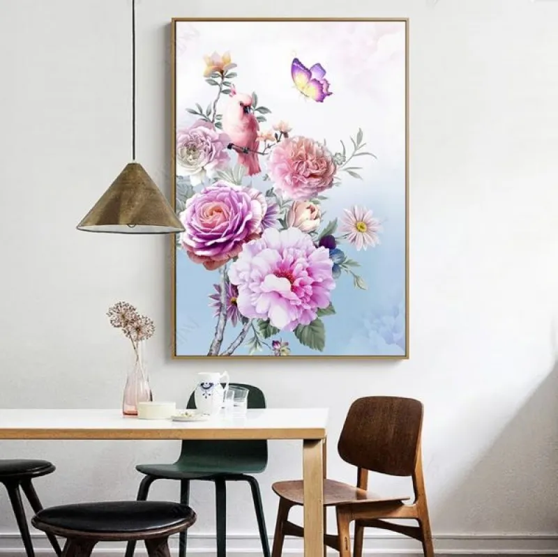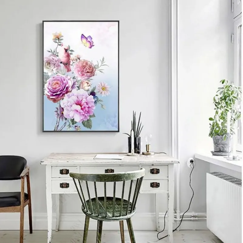 Tranh in canvas hoa hồng, Bên cạnh đó là những bông hoa cúc, chim và bướm màu hồng nhạt đậu trên cành cây và bay lượn phía trên.