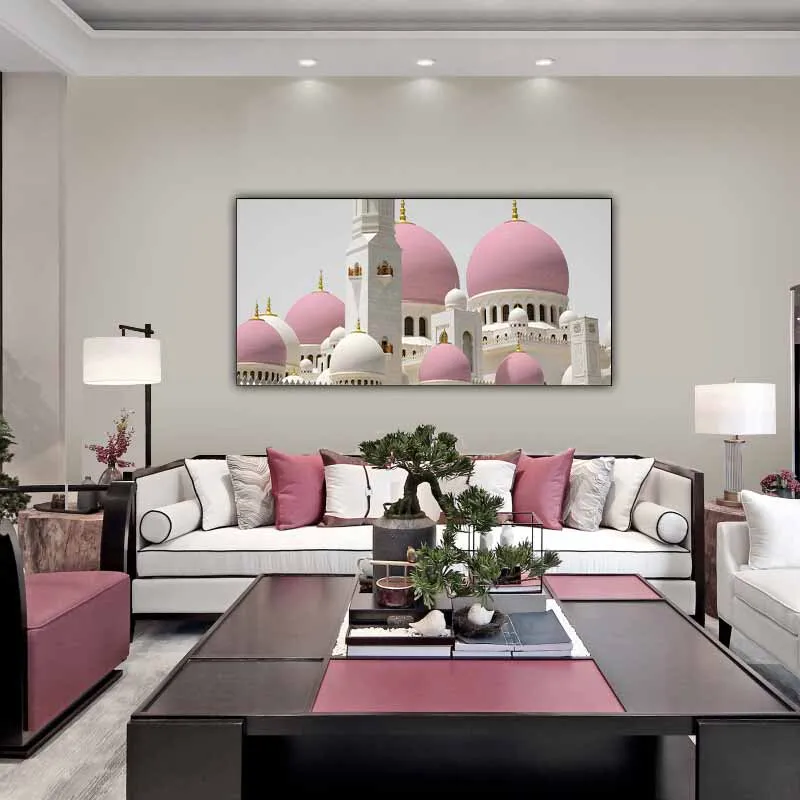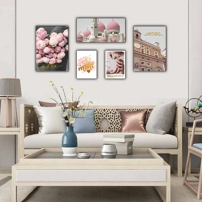 Bộ tranh 5 tấm, kết hợp hoa mẫu đơn màu hồng, Đền thờ Hồi giáo Sheikh Zayed và Palazzo del Collegio romano (Palazzo del Collegio Romano là một tòa nhà lịch sử tọa lạc ở trung tâm Rome, Italy. Tòa nhà được xây dựng vào cuối thế kỷ 16 và được sử dụng như một trường đại học. Nó là một ví dụ tiêu biểu cho kiến trúc Baroque Rome, với các chi tiết tinh xảo và đồ sộ. Hiện nay, Palazzo del Collegio Romano được sử dụng để đặt các cơ quan chính phủ của Ý. Tòa nhà được coi là một trong những công trình kiến trúc đáng chú ý nhất của Rome và thu hút sự chú ý của du khách từ khắp nơi trên thế giới.). Tranh hoa tươi sáng đại diện cho sự nở rộ của mùa xuân, kiến trúc đồ sộ của ngôi đền và tòa nhà tạo ra sự phức tạp và đầy cảm hứng. Bức tranh tạo ra sự hài hòa giữa thiên nhiên và văn hóa, tạo thành một tác phẩm nghệ thuật độc đáo.