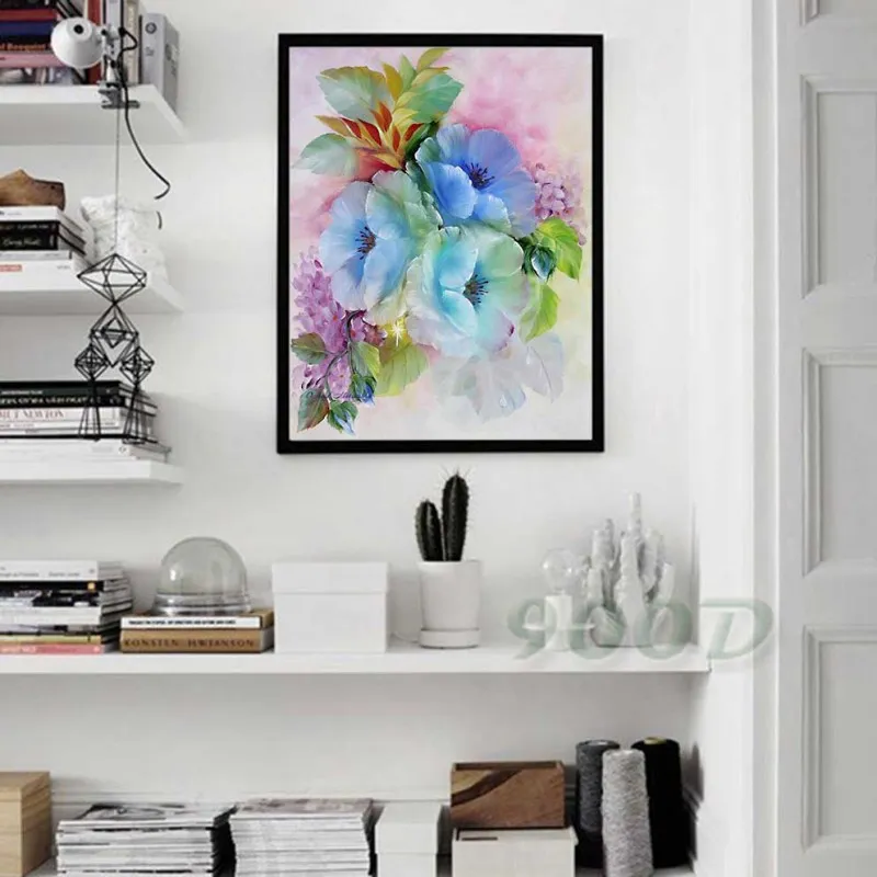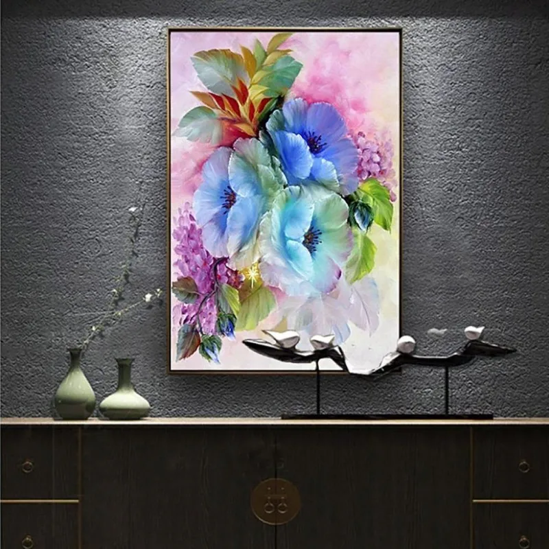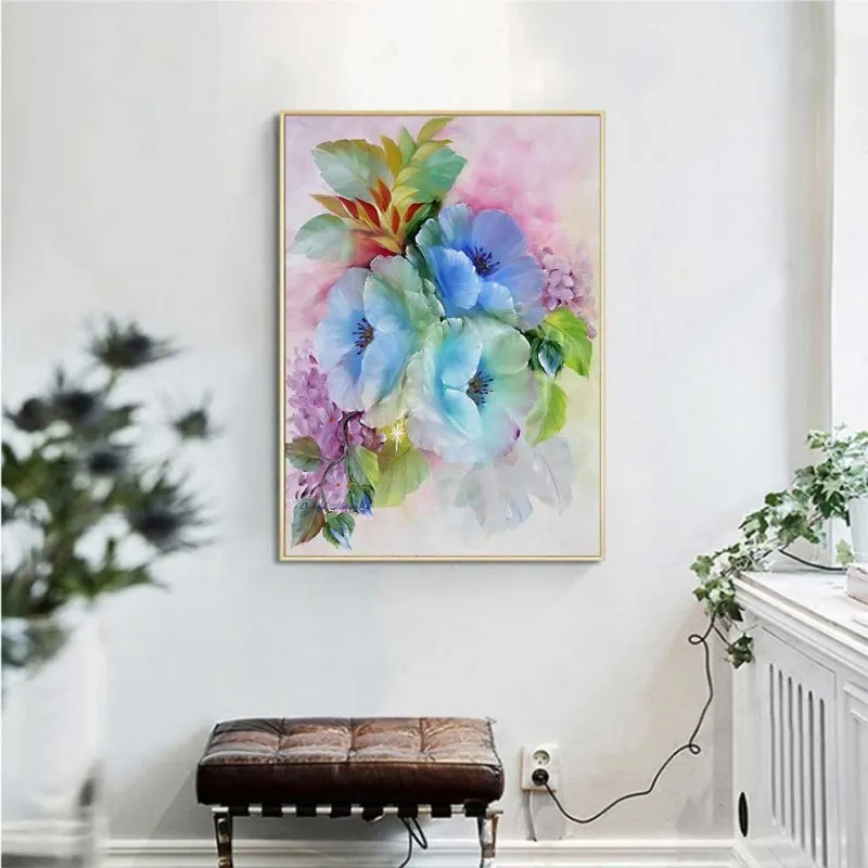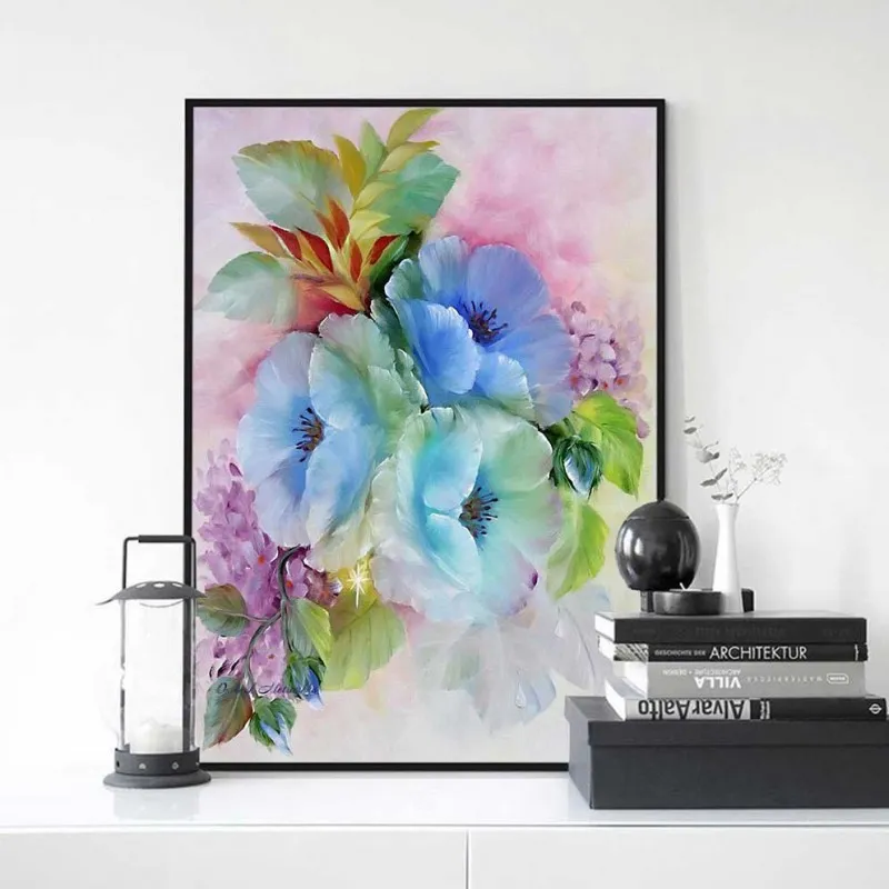 Tranh in canvas những bông hoa Nemophila đặc trưng ở công viên Hitachi, Nhật Bản bên cạnh là những bông hoa cẩm tú cầu.