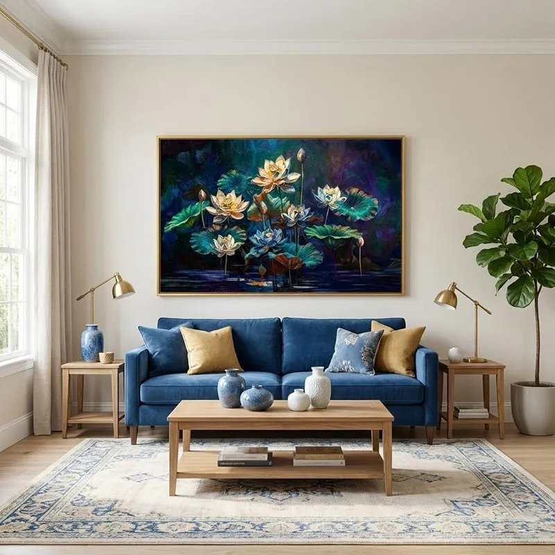 Lý do: Hoa sen là biểu tượng của sự sang trọng và thịnh vượng trong văn hóa Á Đông. Treo bức tranh này tại phòng khách, đặc biệt là vị trí sau ghế sofa, sẽ tạo thành một điểm nhấn "đắt giá", thu hút ánh nhìn và thể hiện gu thẩm mỹ tinh tế, hướng thiện của gia chủ.