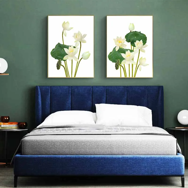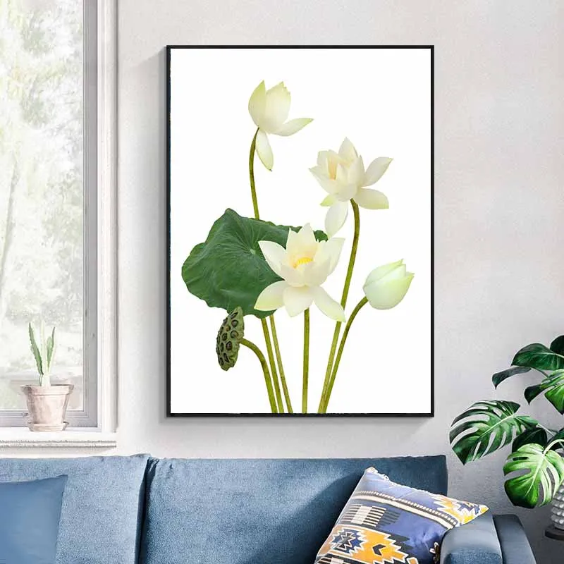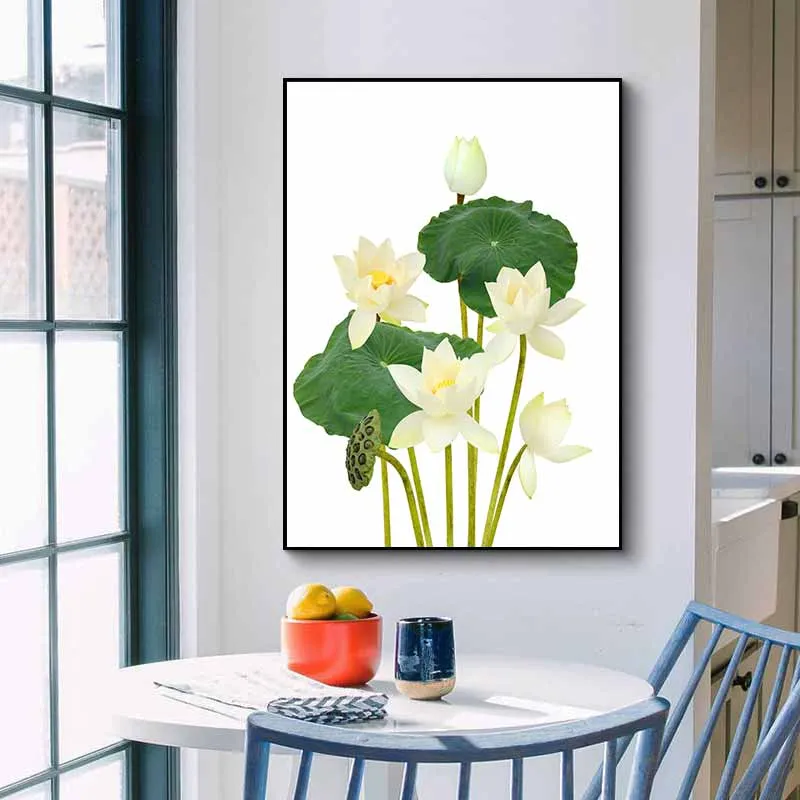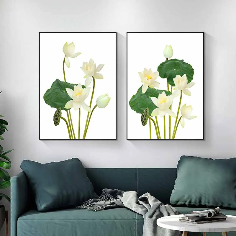 Bộ tranh hoa sen trắng cùng với những chiếc lá xanh nổi bật trên nền trắng làm cho loài Quốc hoa này vốn đã đẹp này càng thêm tinh khiết và trang nhã. Tranh sen trắng có thể treo ở những nơi tôn nghiêm như chỗ thờ cúng, những nơi yên tĩnh cần nghỉ ngơi thư giãn như phòng ngủ, các tiệm Spa hay các phòng tập Yoga...