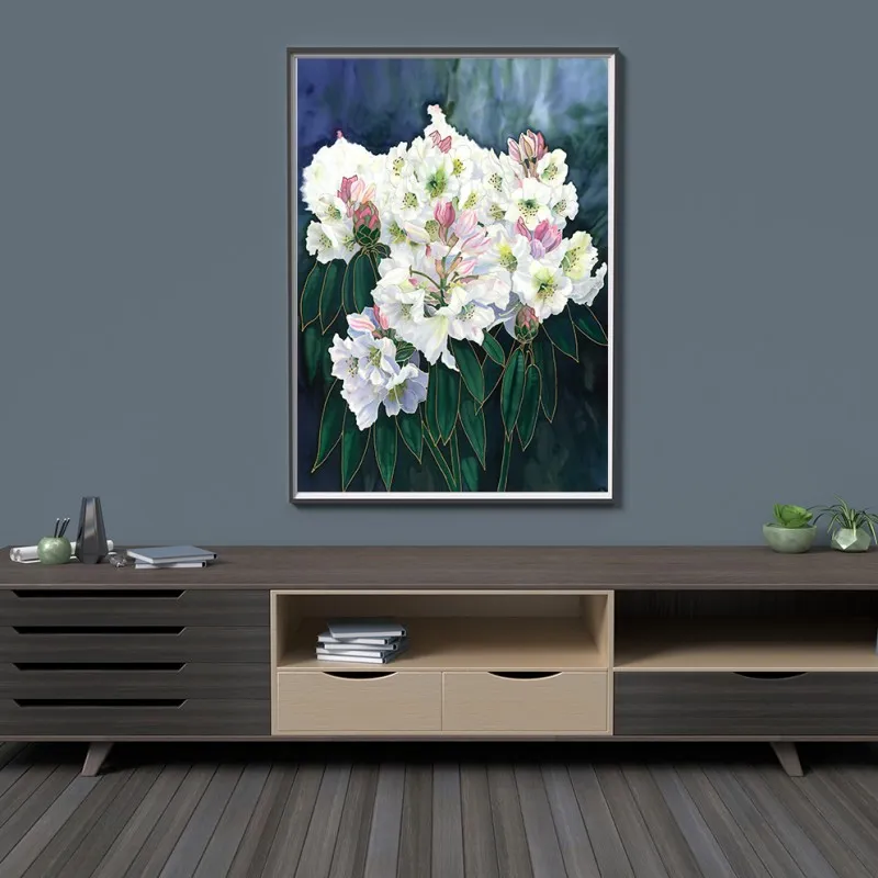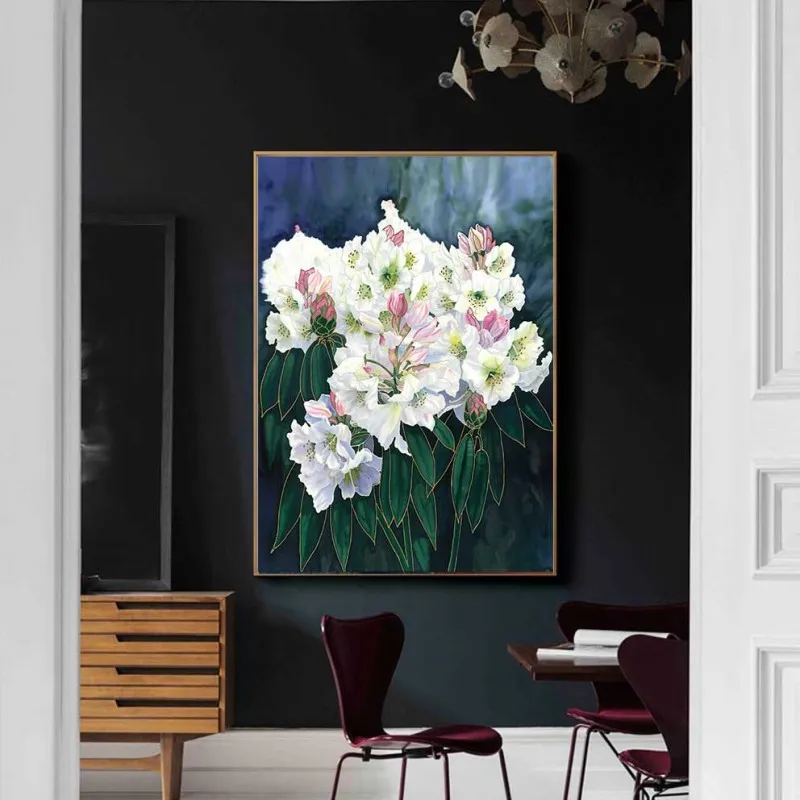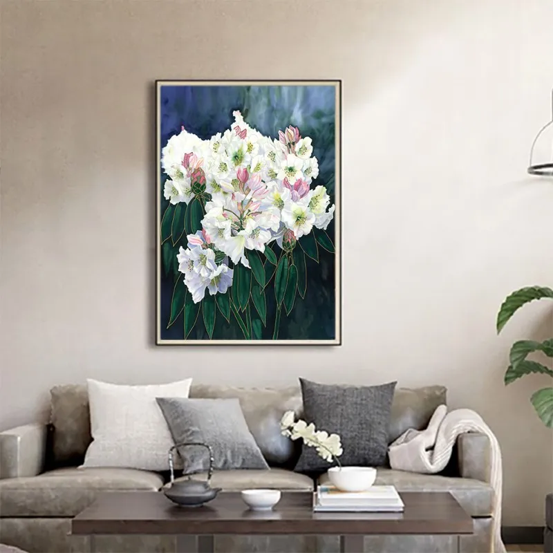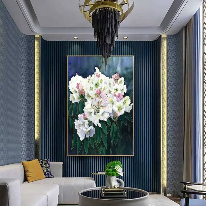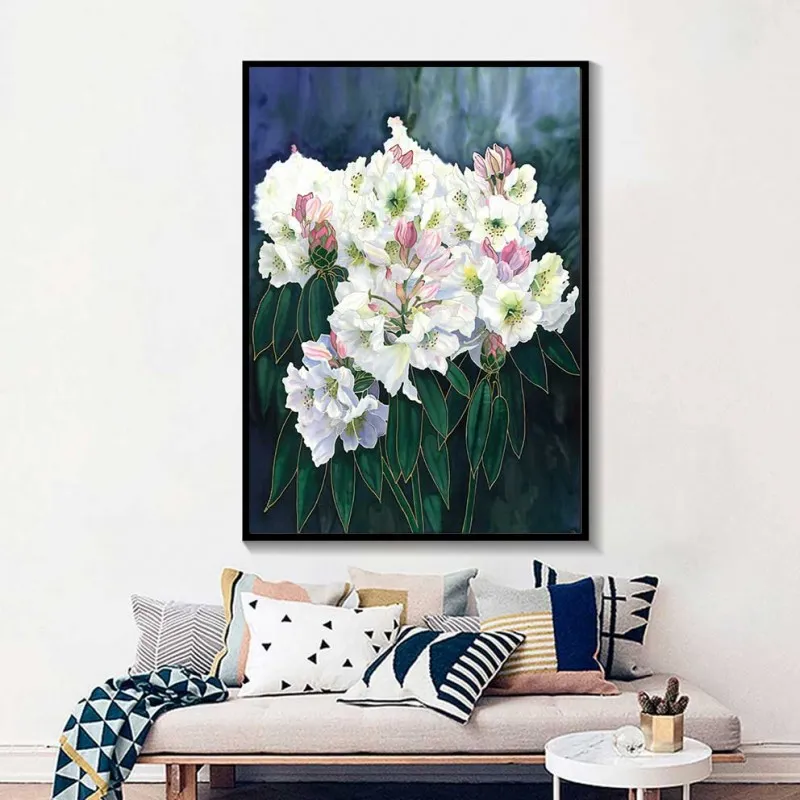 Tranh in canvas bông hoa màu trắng trên nền xanh.