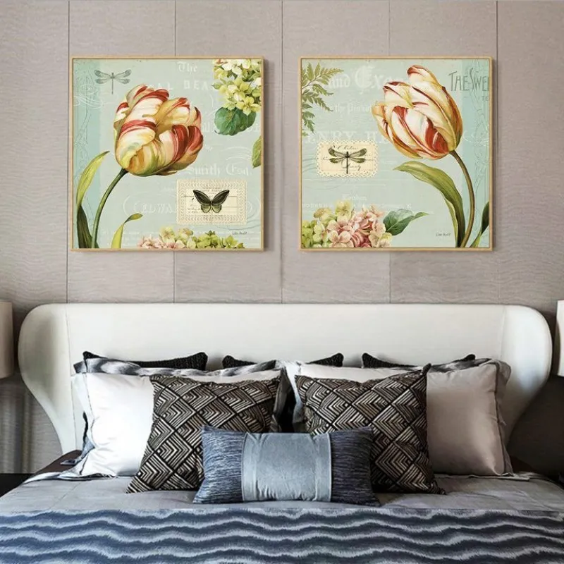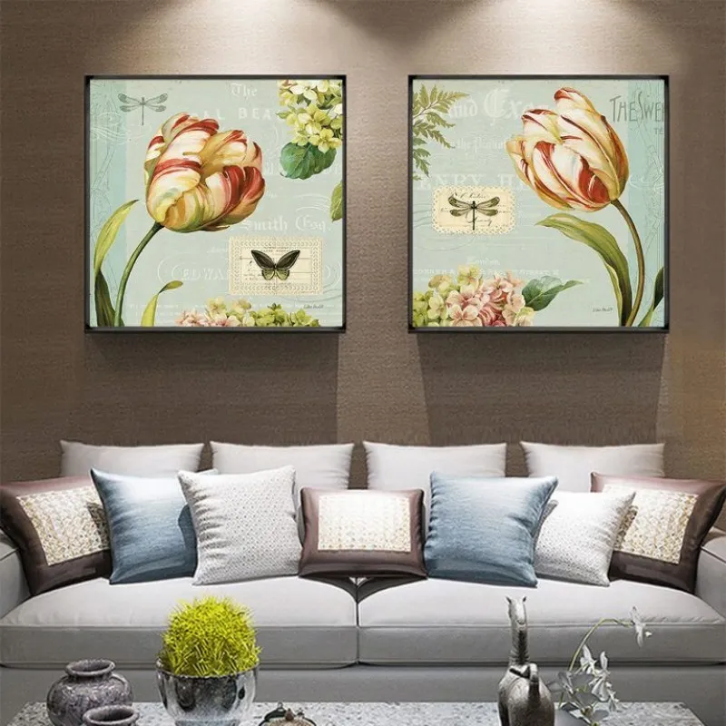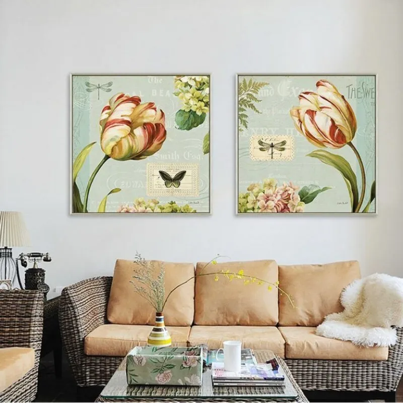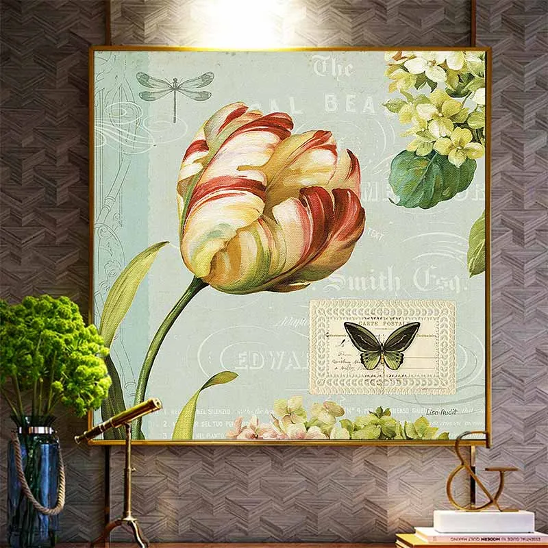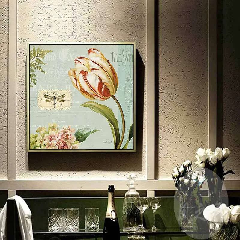 Tranh in canvas hoa Tulip tượng trưng cho sự nổi tiếng, giàu có và tình yêu hoàn hảo. Trong tranh còn có chuồn chuồn, bướm, và nhiều bông hoa nhỏ khác, màu sắc cổ điển mang phong cách retro.