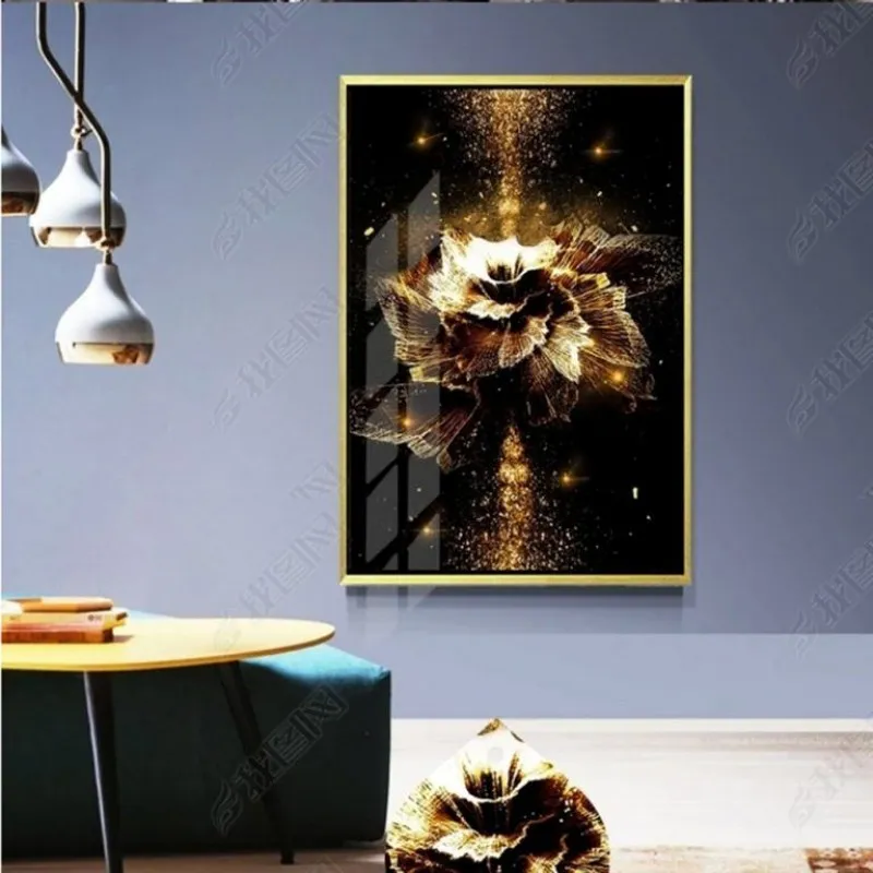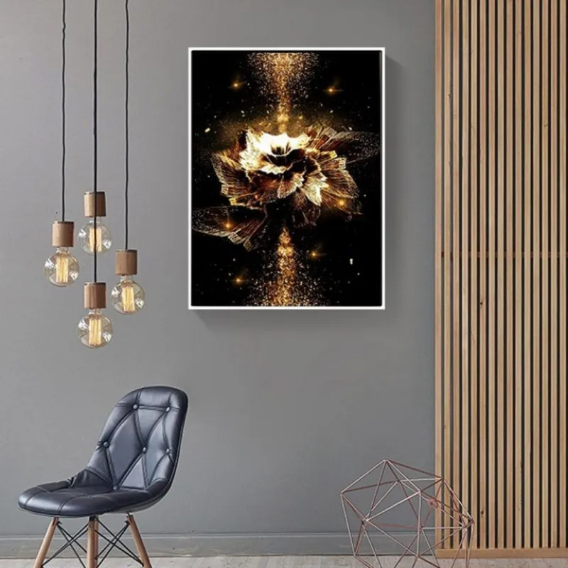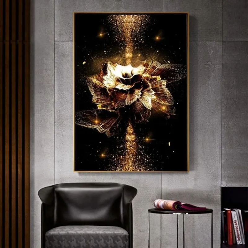 Tranh in canvas hoa vàng golden trừu tượng trên nền đen.