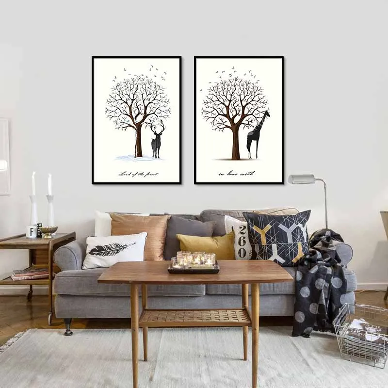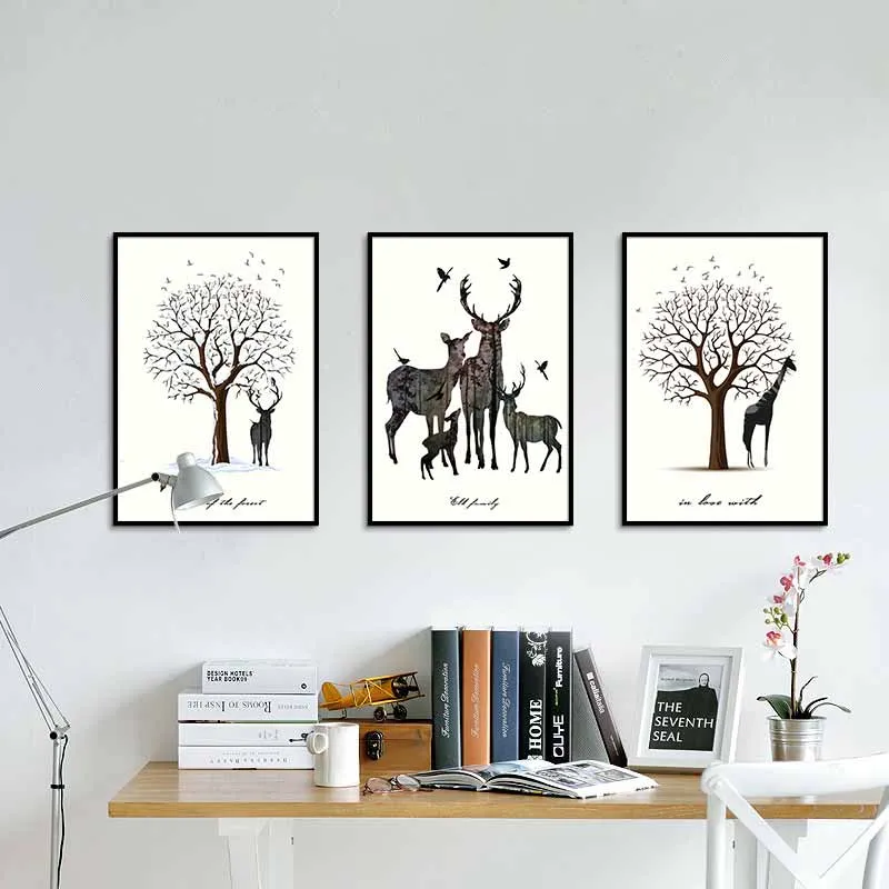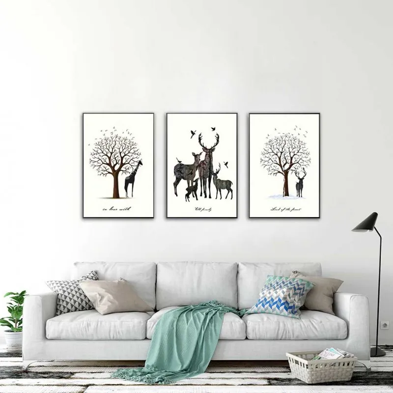 Tranh đàn nai, hươu cao cổ cùng với cây lớn trụi lá vào mùa đông, với màu sắc sinh động, kiểu cách sáng tạo, nhiều cây cối lồng vào bên trong thân nai.