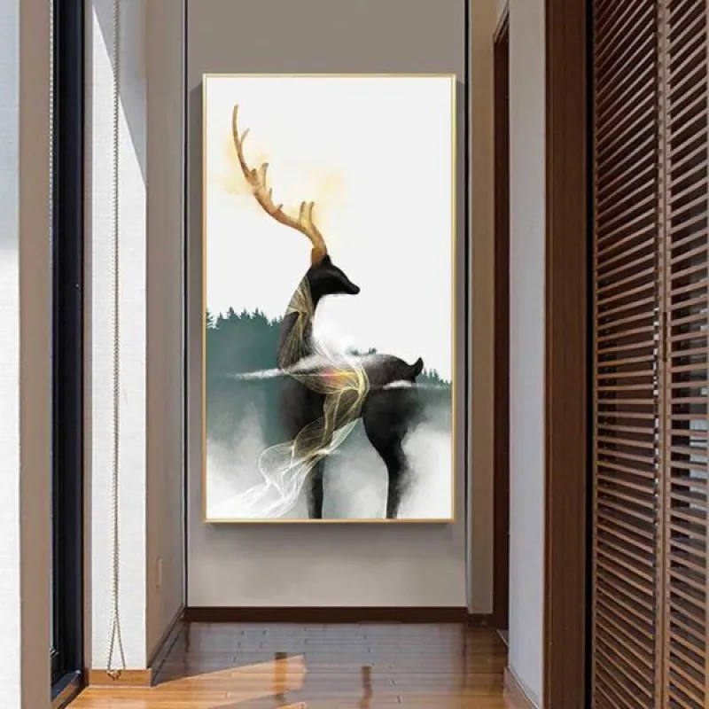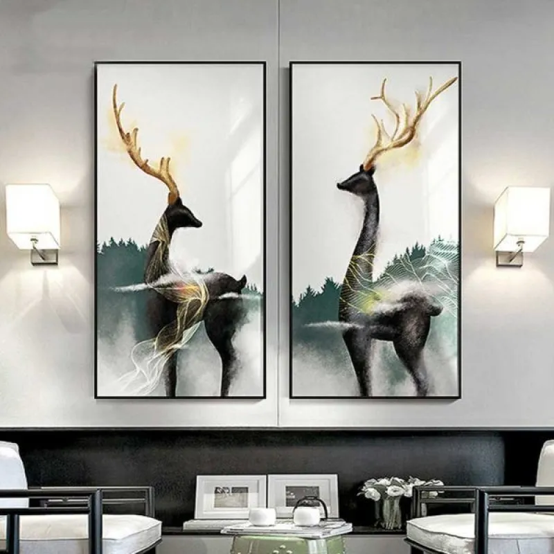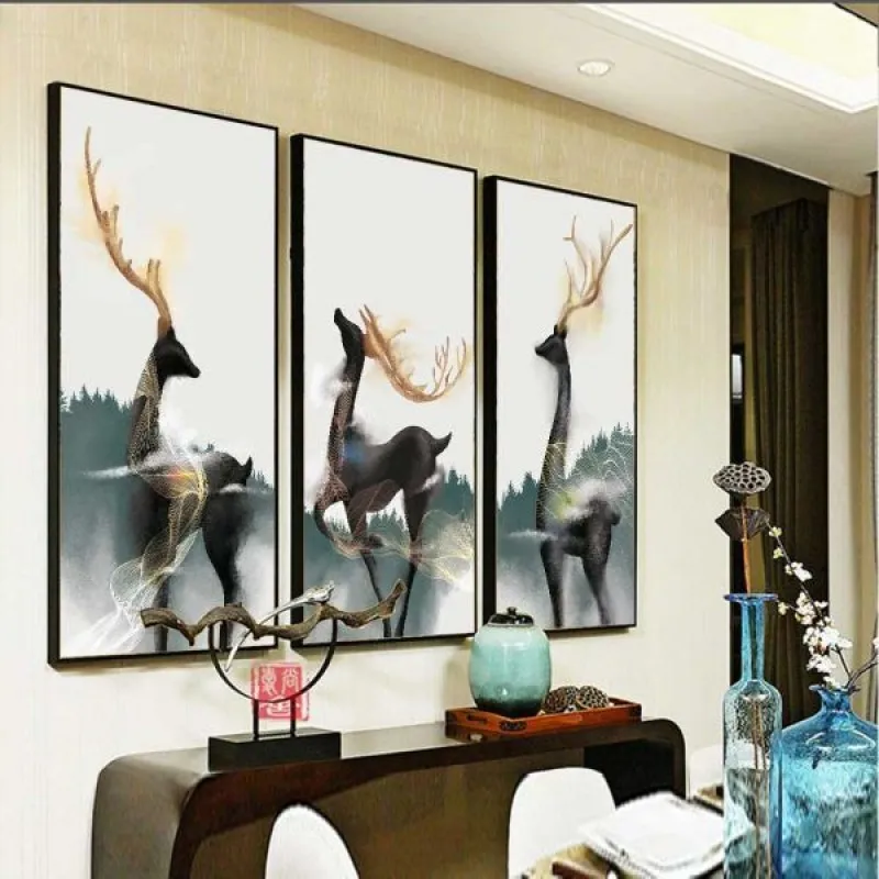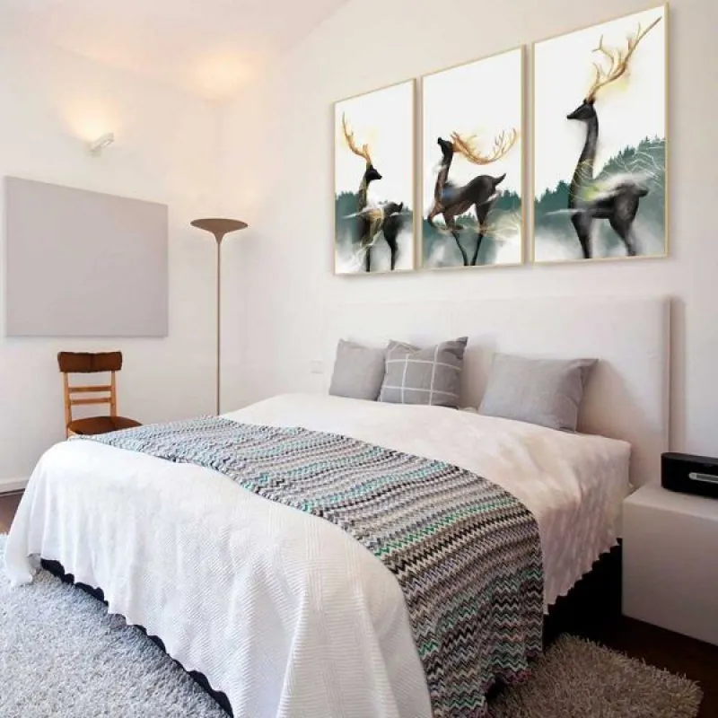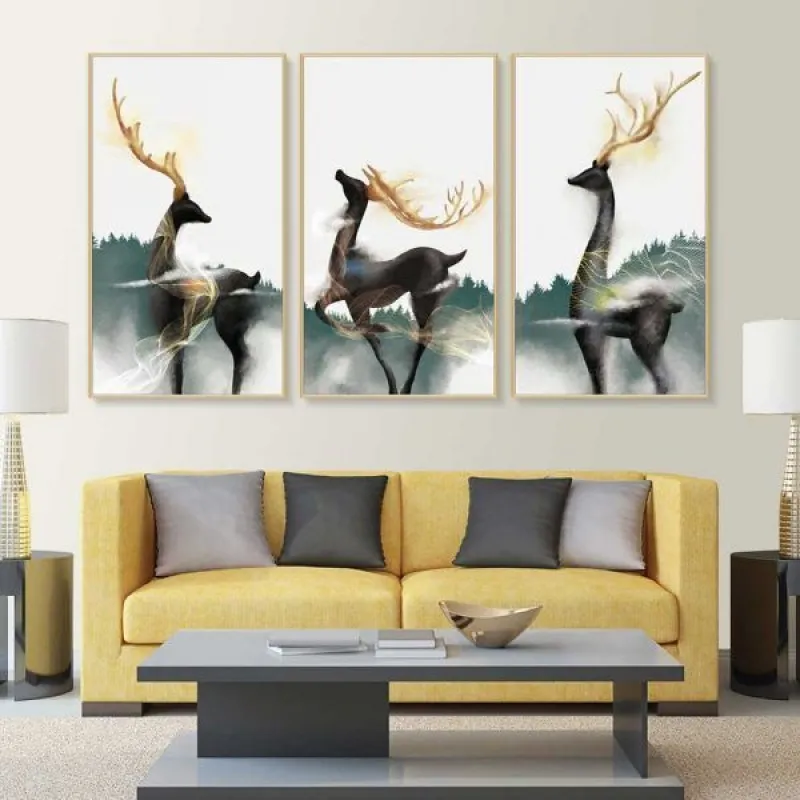 Tranh canvas Tranh hươu nai sừng vàng trừu tượng, với sắc xanh và trắng là màu vàng của sừng làm cho bộ tranh thêm nổi bật. Tranh phong thủy nai luôn là thể loại được người kinh doanh yêu thích vì nai theo âm hán là lộc cũng có nghĩa là tài lộc. Tranh thích hợp treo ở phòng khách, phòng làm việc, phòng ngủ, quán cà phê, chân cầu thang, bàn học, bàn làm việc…