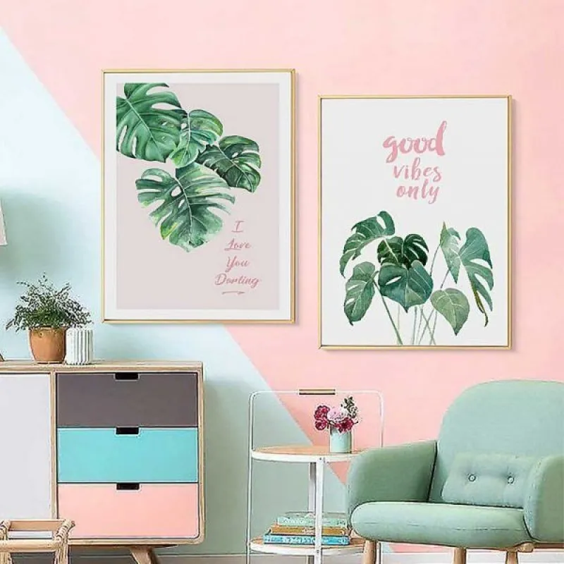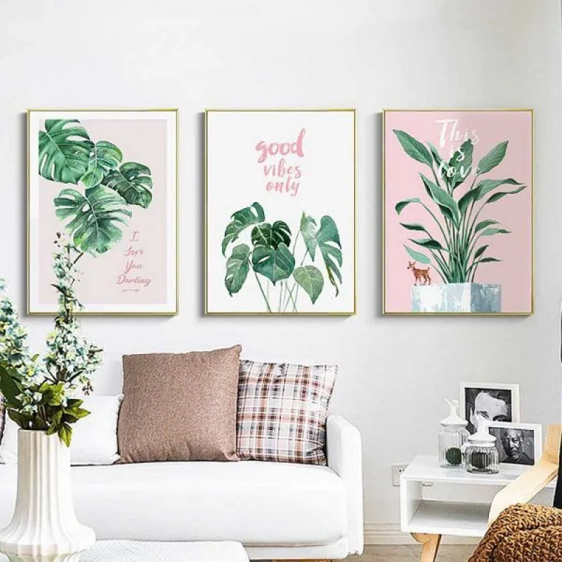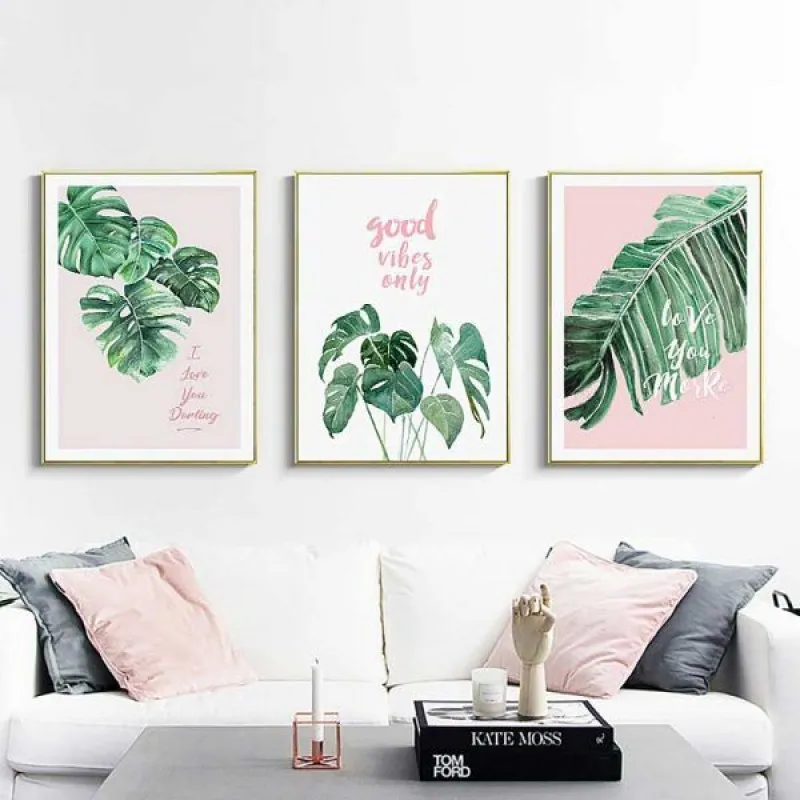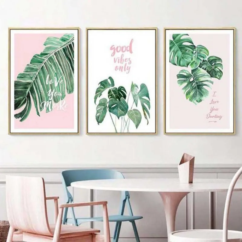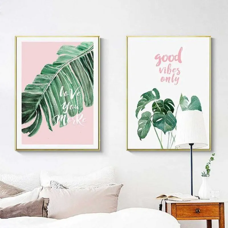 Tranh in canvas lá cây nhiệt đới lá chuối, lá cọ kết hợp chữ “This is love”, “good vibes only”, “love you more”, “I love you darling”, thích hợp treo ở phòng khách, phòng làm việc, phòng ngủ, quán cà phê, chân cầu thang, bàn học, bàn làm việc…