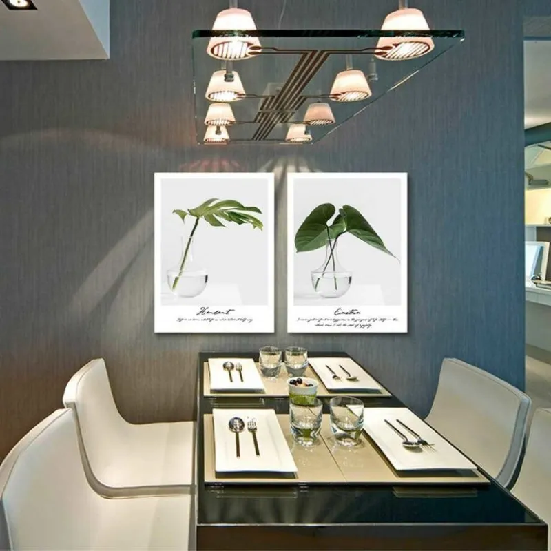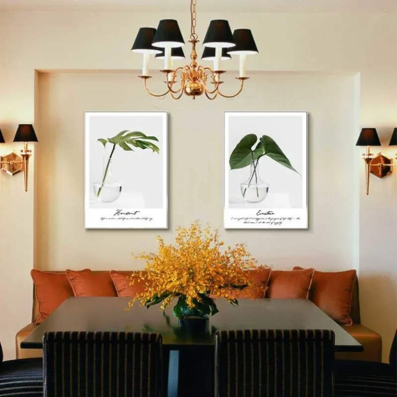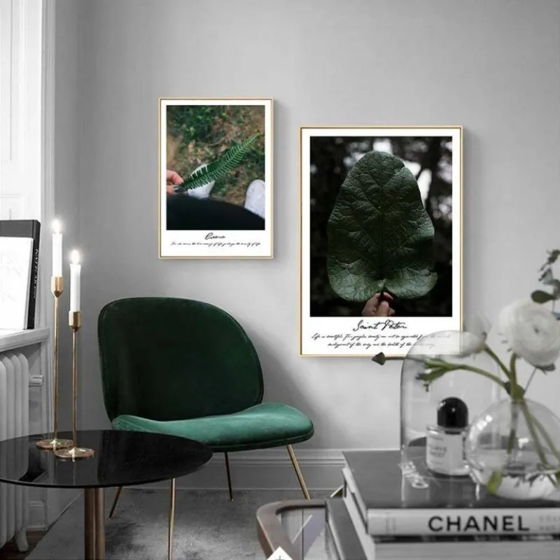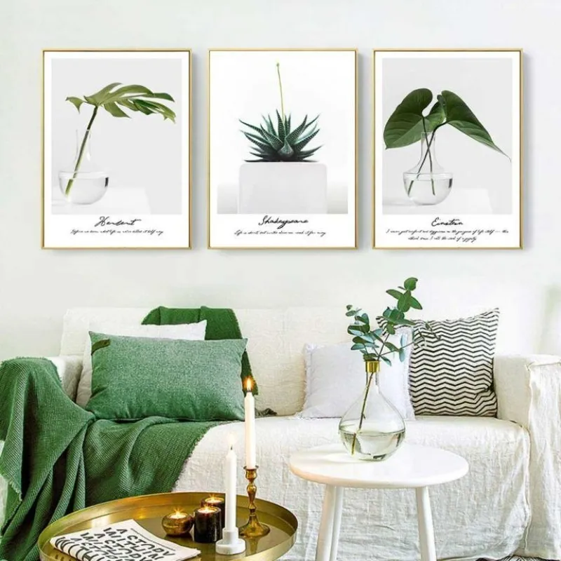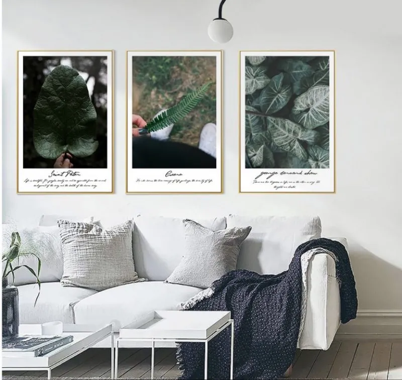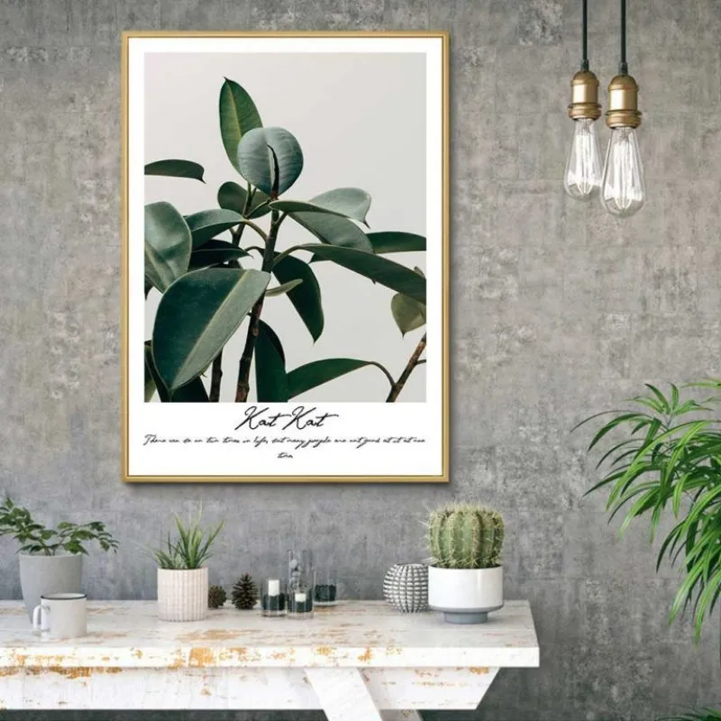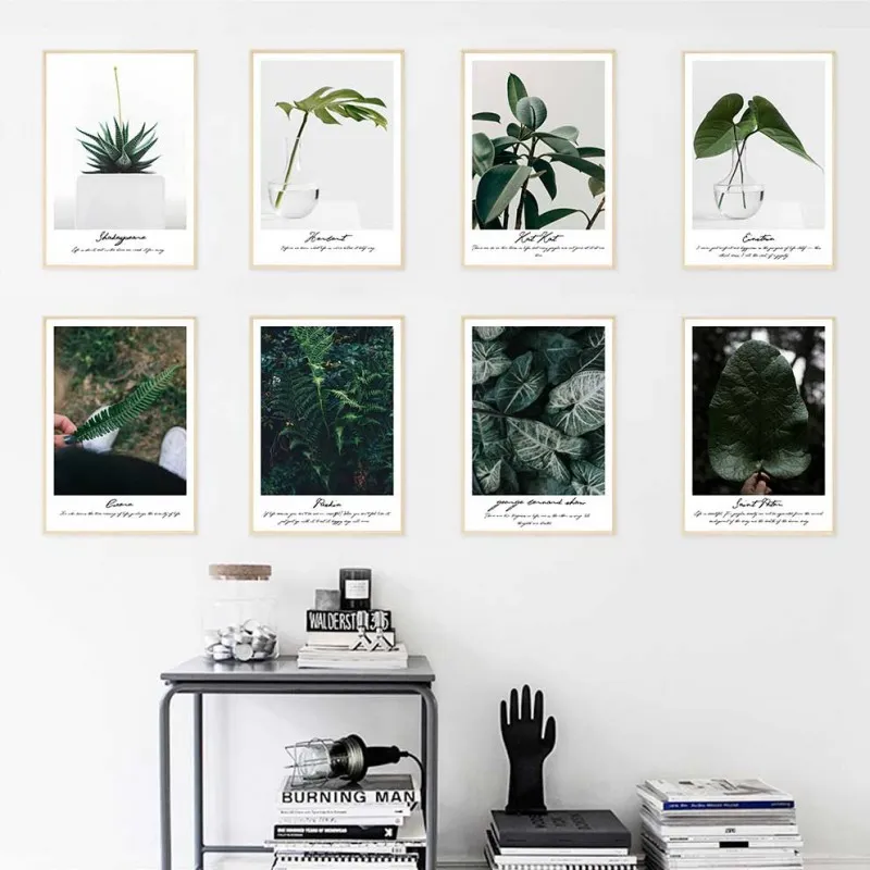 Tranh in canvas các loại thực vật lá cây lá dương xỉ, lá trầu bà, bụi cây nhỏ, cây dương xỉ, cây mù u kết hợp chữ là tên của loại cây ở phía dưới.