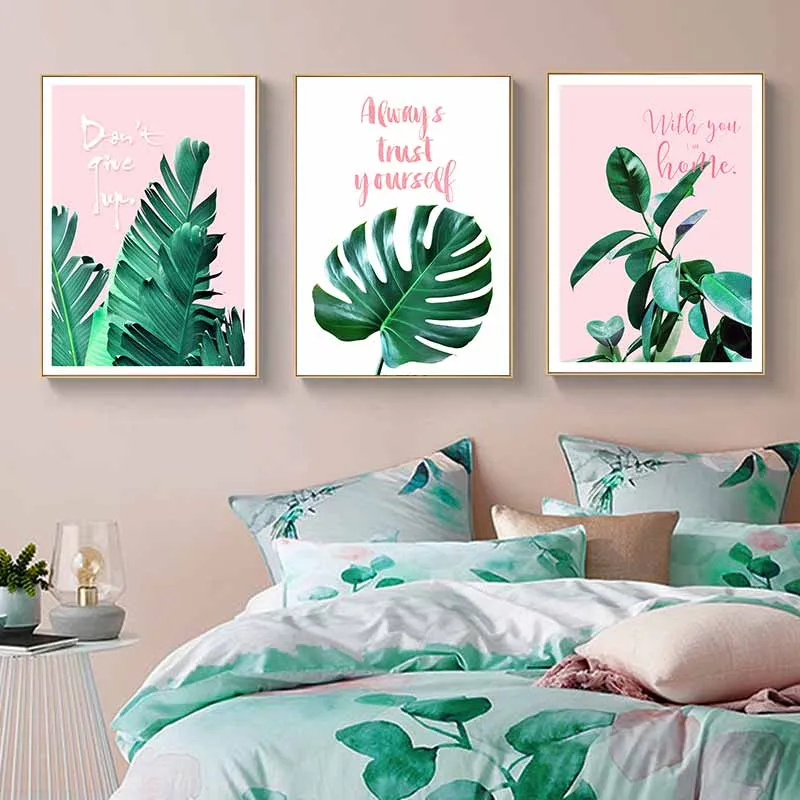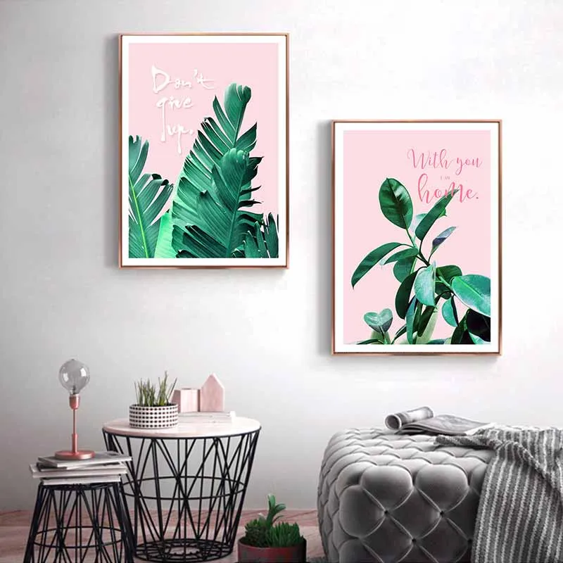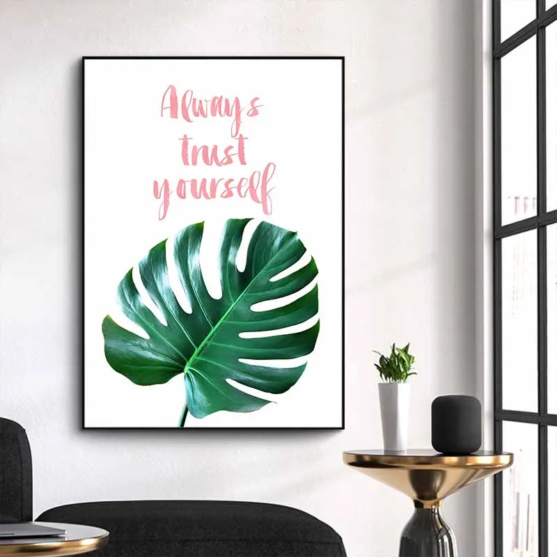 Tranh lá cây nhiệt đới lá trầu bà Nam Mỹ, lá chuối, lá đa kết hợp chữ Don't give up, Always trust yourself, With you I am home.