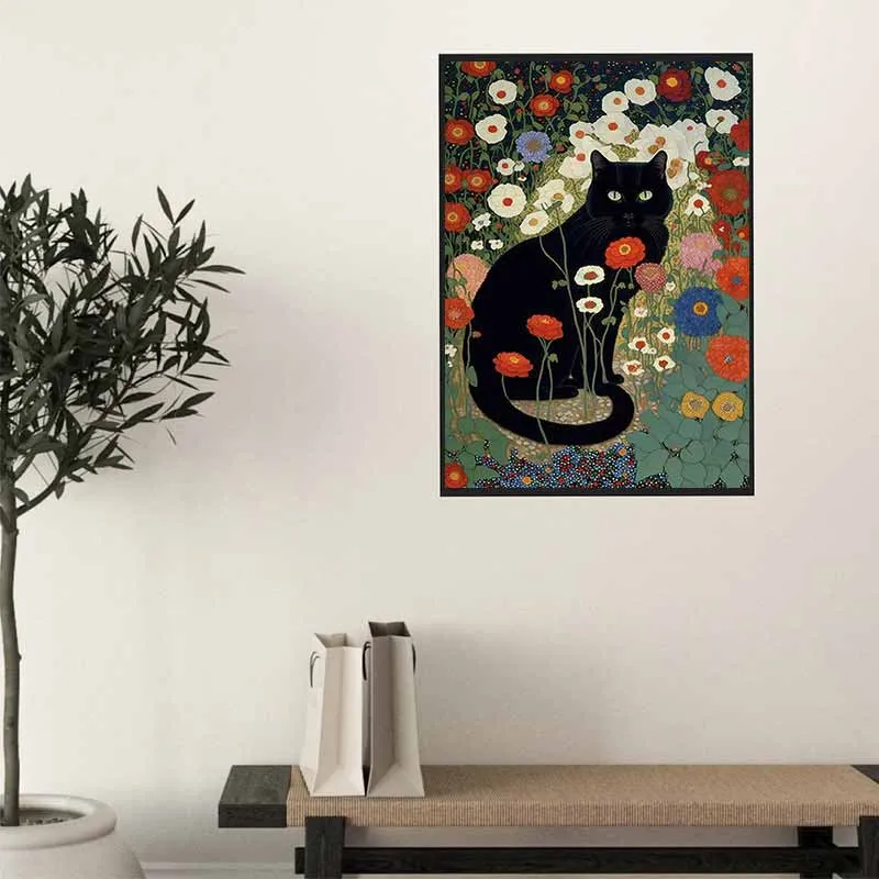 Tranh mèo đen trong vườn hoa nhiều màu sắc