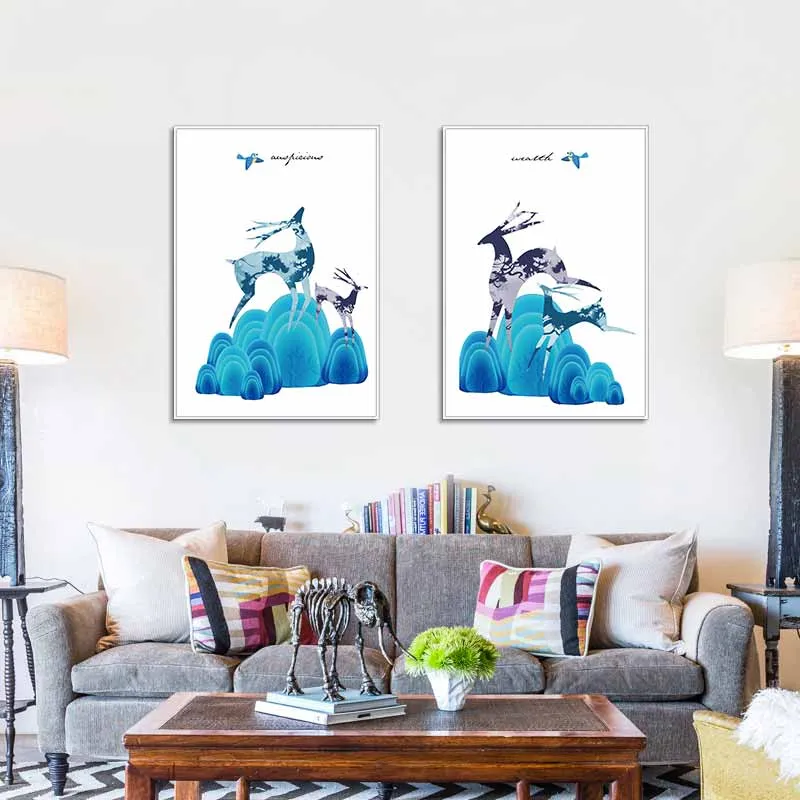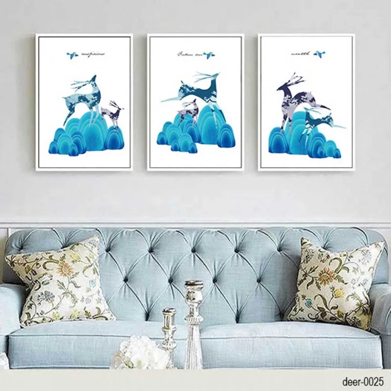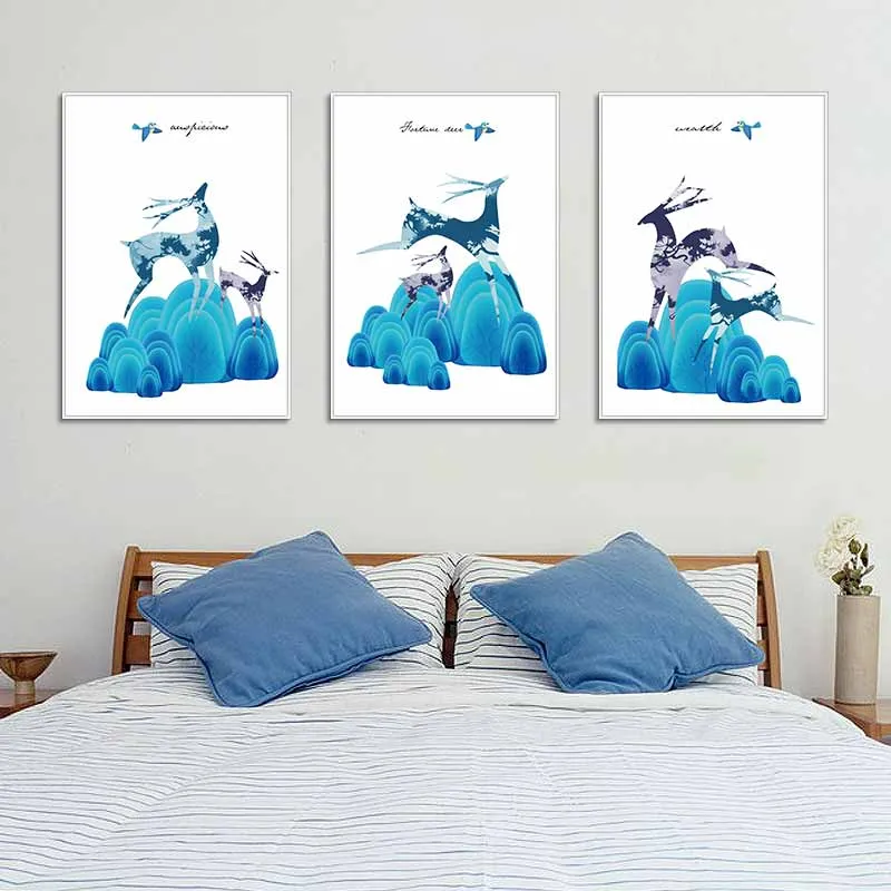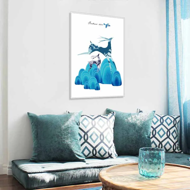 Tranh Nai cách điệu chạy nhảy trên những tảng đá màu xanh trừu tượng
