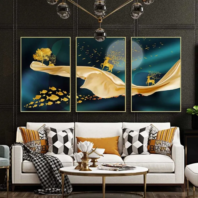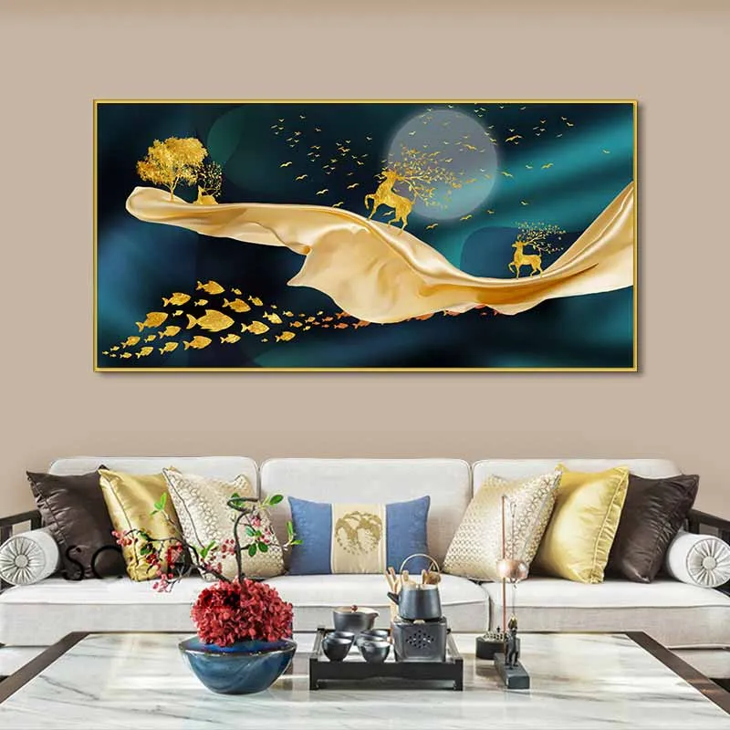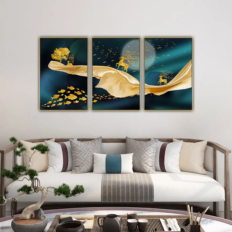 Bộ tranh thể hiện hình ảnh 3 chú nai đứng trên 1 dải lụa vàng như đang đúng trên đồi núi, phía trước là 1 chú nai đang nằm dưới bóng mát gốc cây, ở trên là đàn chim đang tung bay, phía dưới là đàn cá. Tất cả đều 1 sắc vàng rực rỡ lung linh tựa như vàng trên nền xanh quý phái. Đây là 1 trong những mẫu tranh phong thủy rất được ưa chuộng. nai theo ấm Hán Việt nghĩa là lộc cũng có nghĩa là tài lộc, xung quanh là đàn chim và đàn cá thể hiện sự sung túc và đầy đủ.