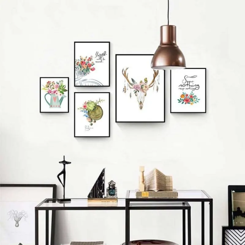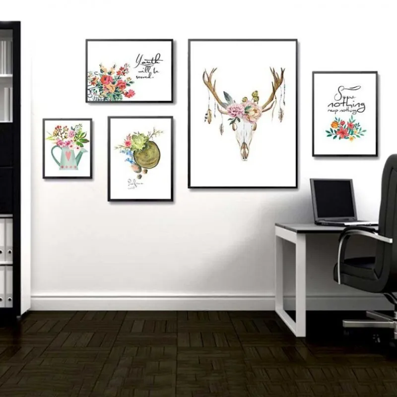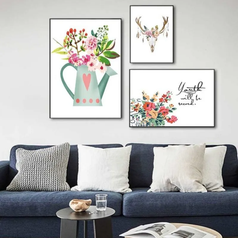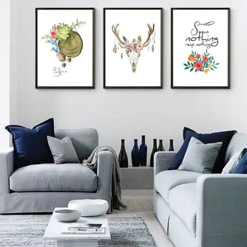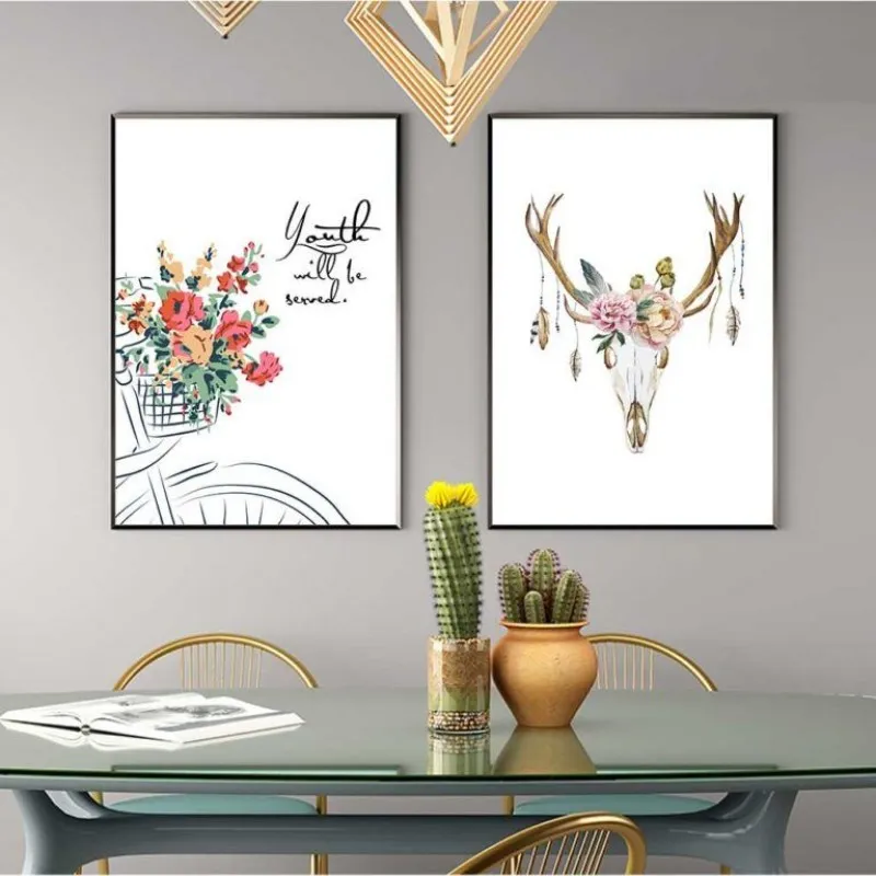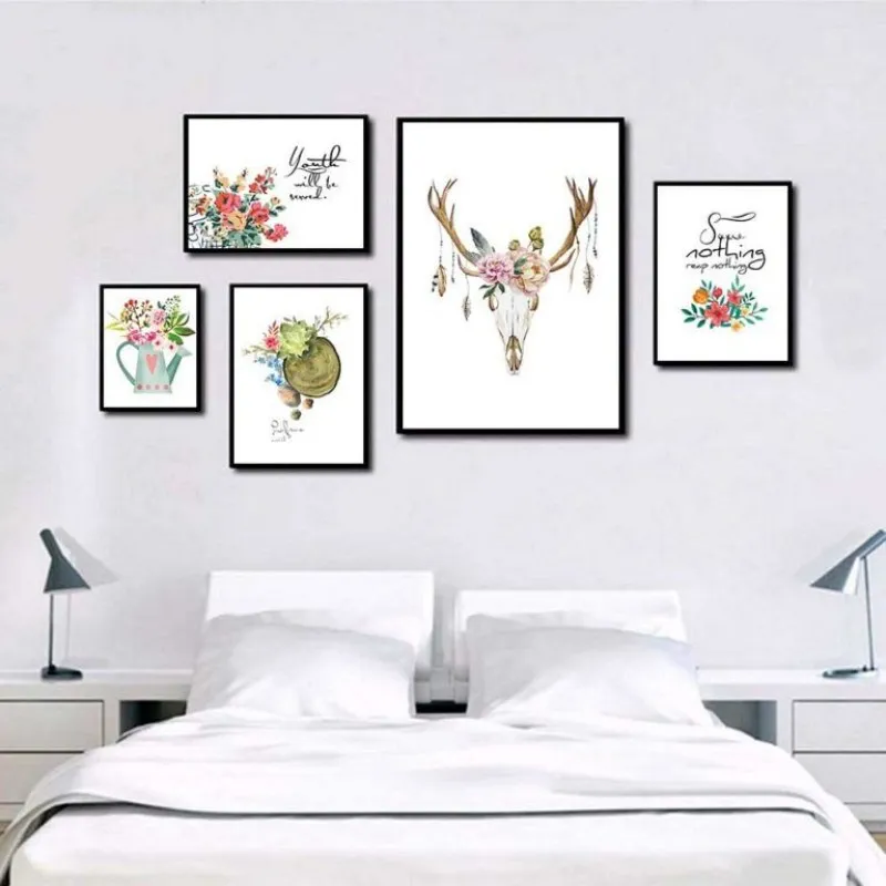 Tranh in canvas Scandinavian nai hươu với những bông hoa và bình hoa kết hợp chữ some nothing reap nothing, youth will be several.