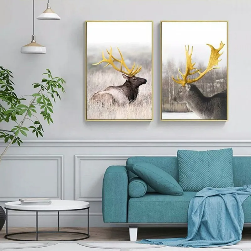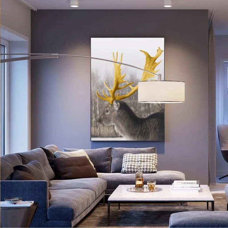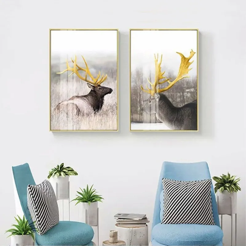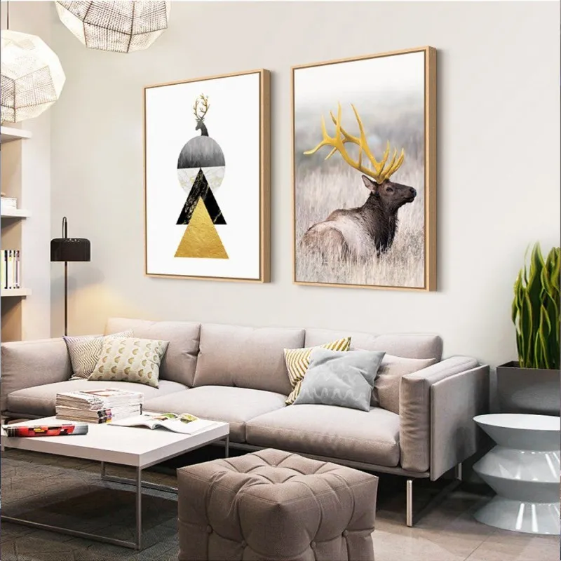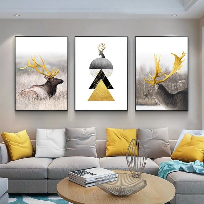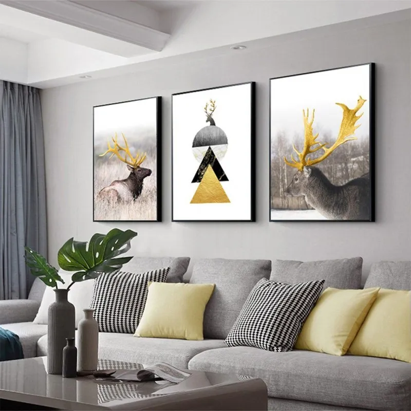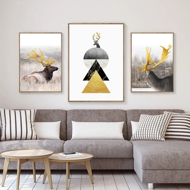 Tranh nai có âm hán là lộc cũng là đồng âm với lợi lộc tiền tài, theo phong thủy thì gia chủ sẽ làm ăn phát đạt thuận buồm xuôi mái. Vì vậy thể loại tranh này rất được ưa chuộng. Trong bộ tranh còn có 2 hình tam giác chồng lên nhau trong đó có 1 tam giác vàng tượng trưng núi vàng mang ý nghĩa đầy đủ, sung túc, bền chắc và vững chãi. Mẫu tranh này phù hợp với những gia đình kinh doanh.