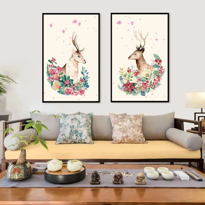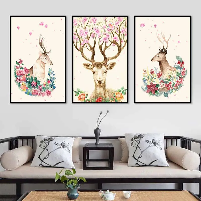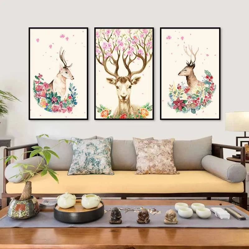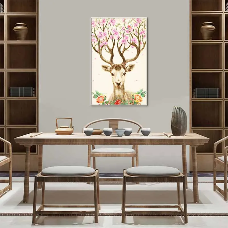 Tranh Nai trừu tượng và vòng hoa hồng quanh cổ