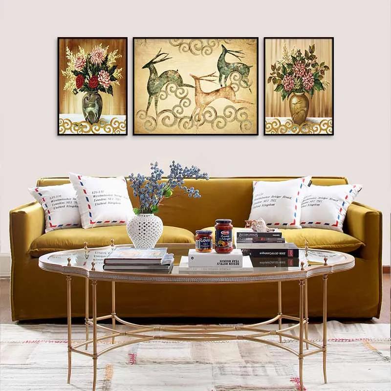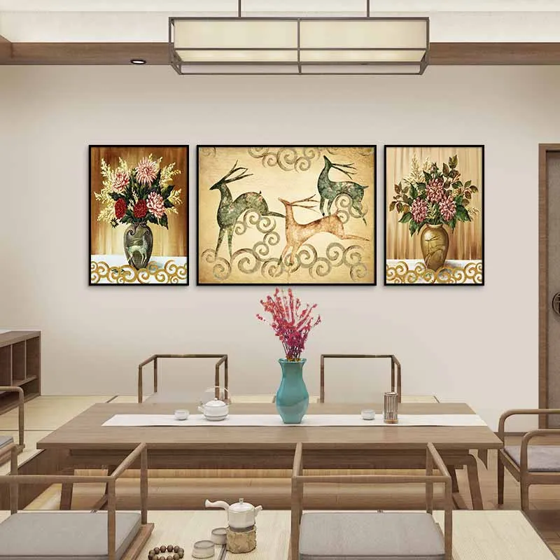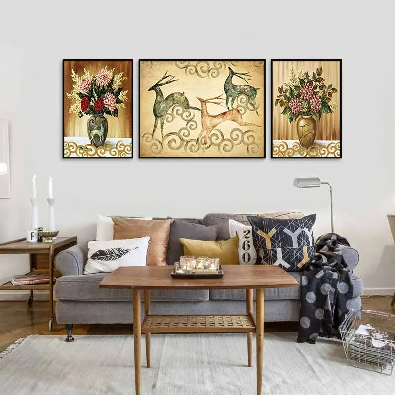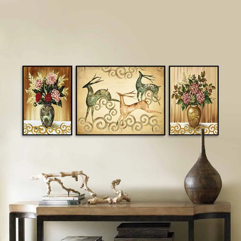 Tranh đàn nai và bình hoa, với hoa văn lạ mắt và tông màu nâu cổ điển đem lại vẻ ấm cúng cho ngôi nhà của bạn thích hợp treo ở phòng khách, phòng làm việc, phòng ngủ, phòng truyền thống, nhà văn hóa, quán cà phê, chân cầu thang, tranh lẻ nhỏ để ở bàn học, bàn làm việc,…