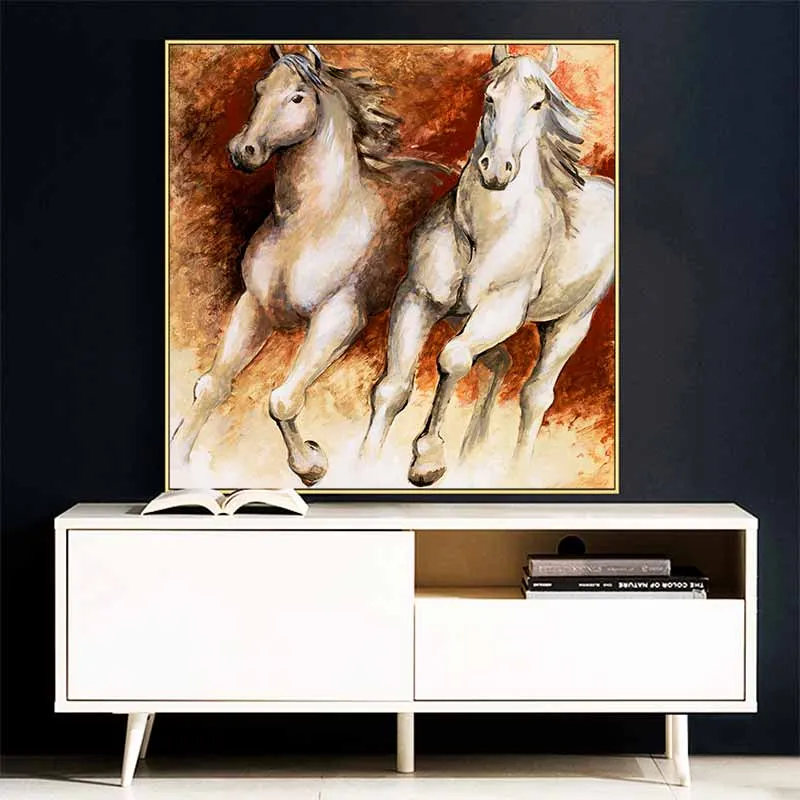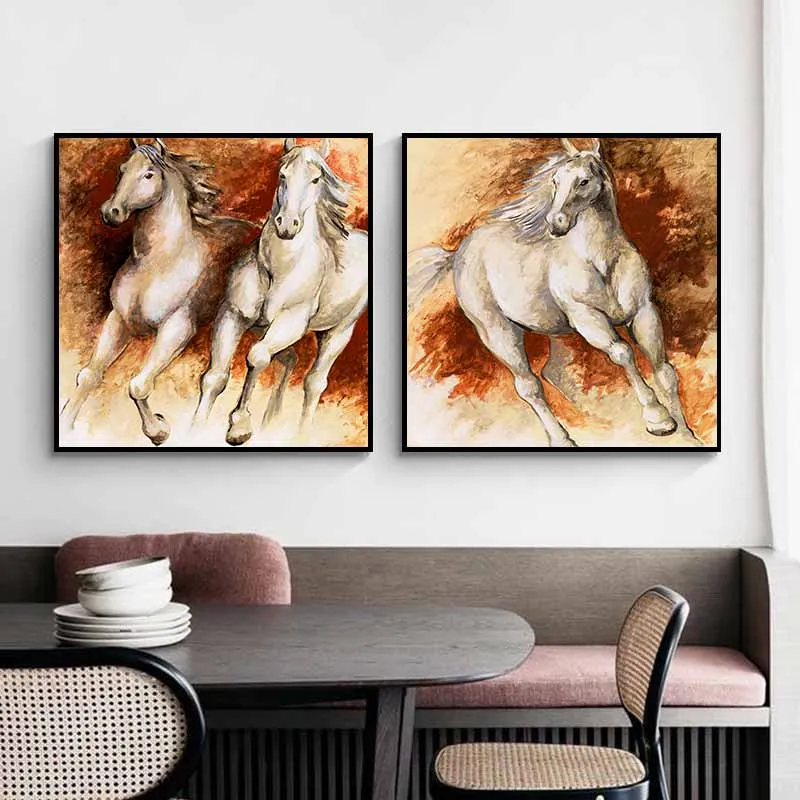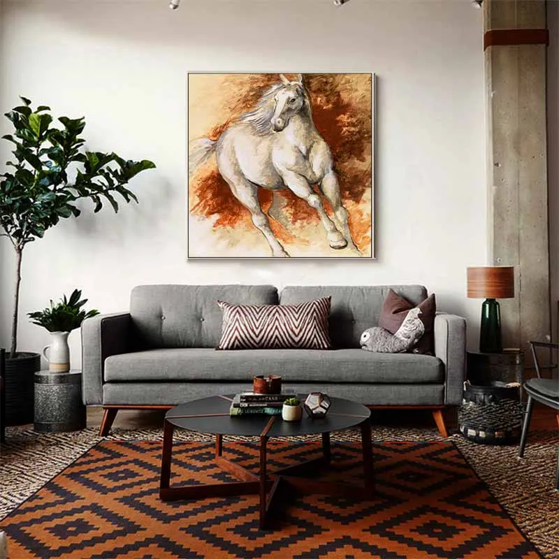 Tranh ngựa trắng đang phi nước đại với nền màu nâu loang