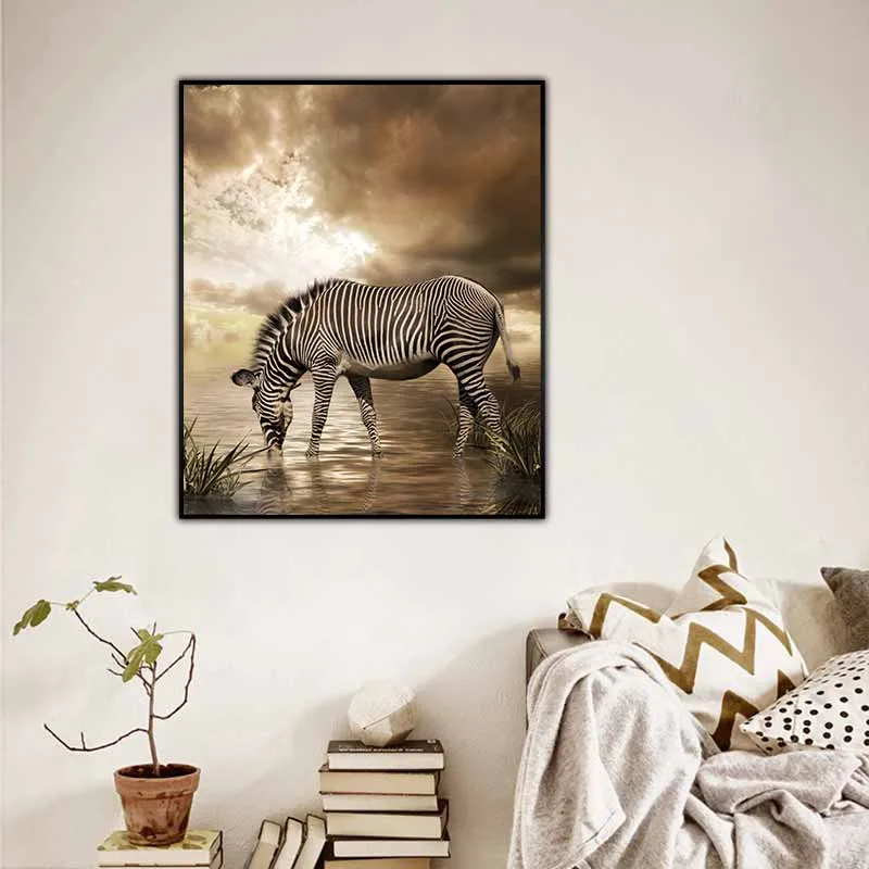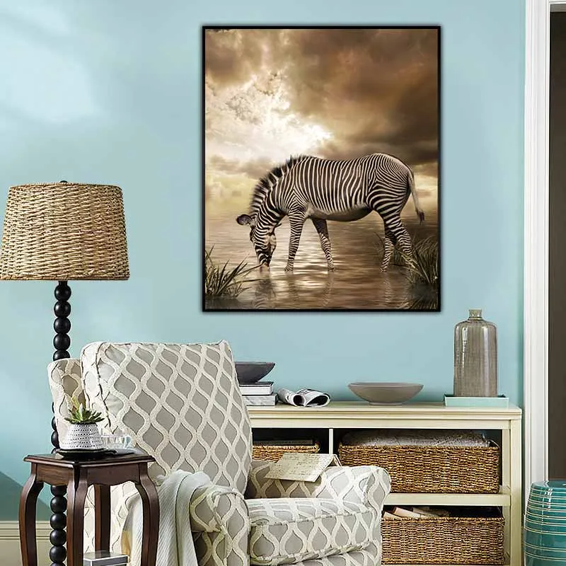 Tranh ngựa vằn đang uống nước bên bờ sông