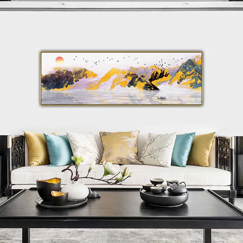 Tranh núi đồi với sắc vàng đen trừu tượng, dưới dòng sông có người đang trẻo thuyền