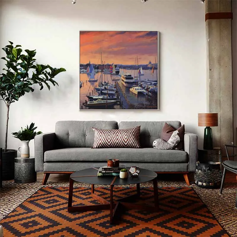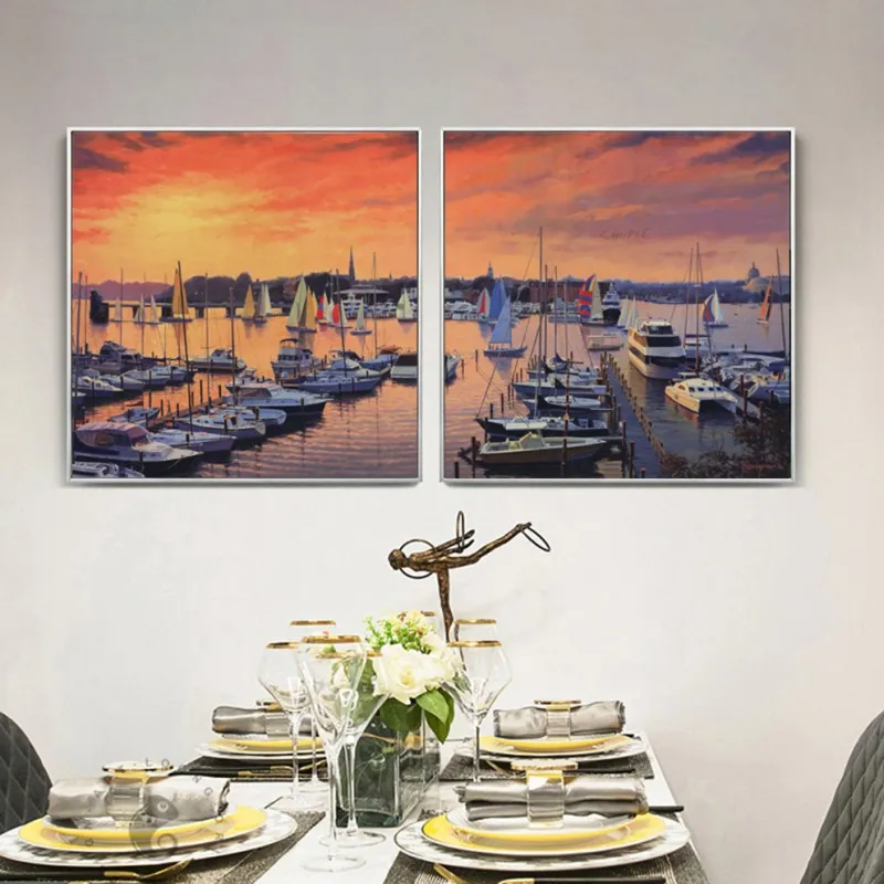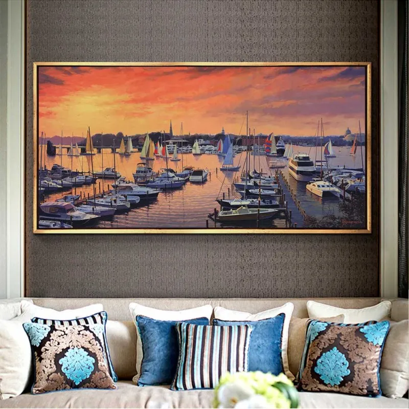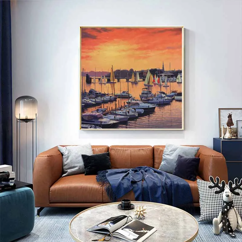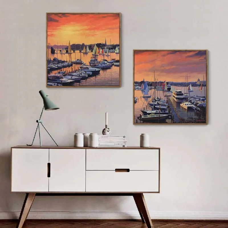 Tranh in canvas bản gốc do họa sĩ Yachang Fjyh vẽ cảnh bờ biển bến cảng buổi chiều hoàng hôn, nơi những chiếc du thuyền neo đậu.
