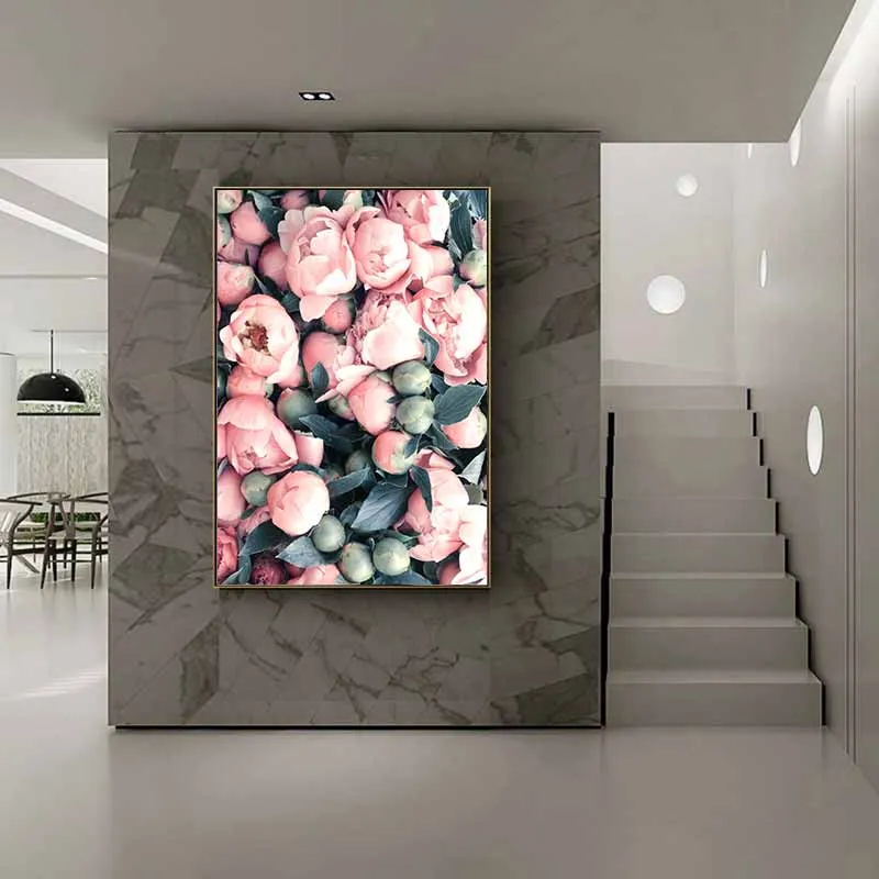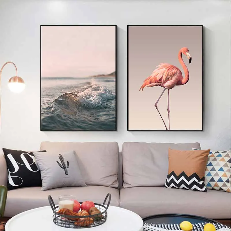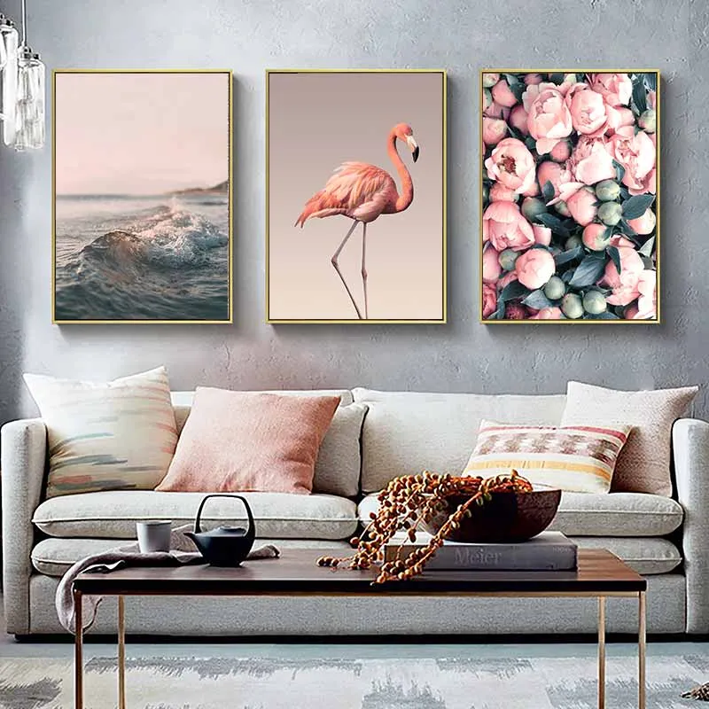 Tranh phong cảnh biển, chim hồng hạc và hoa mẫu đơn