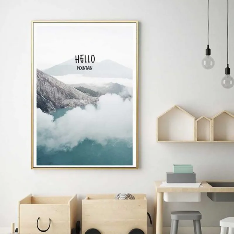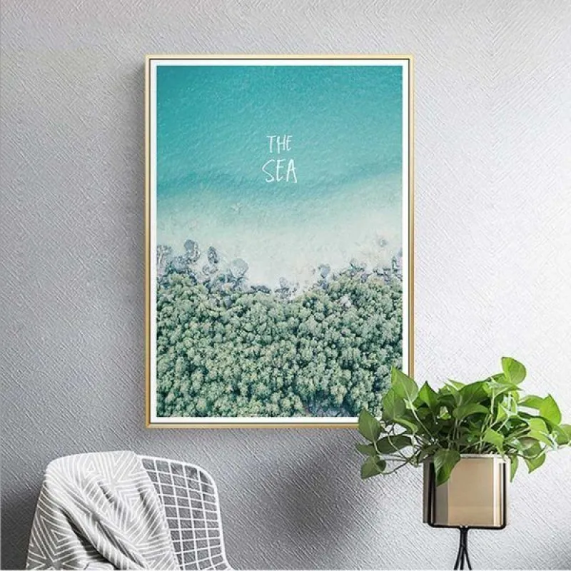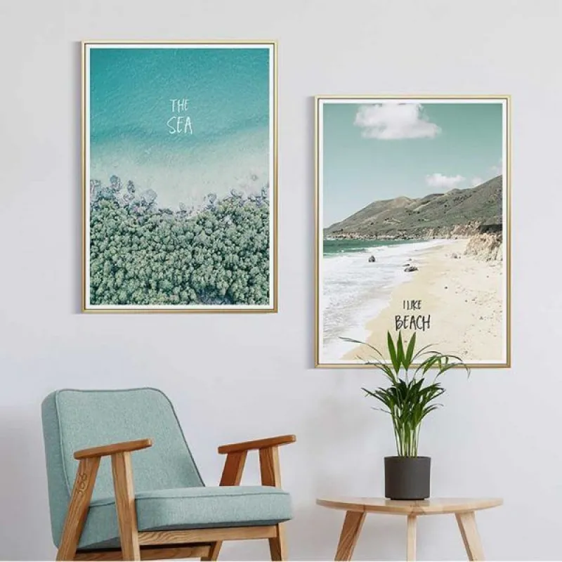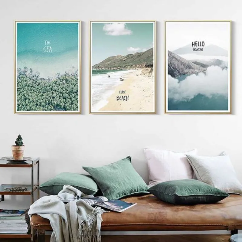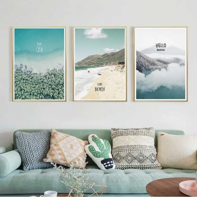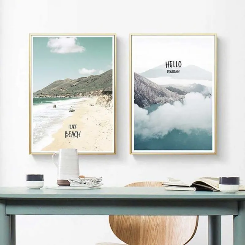 Tranh in canvas phong cảnh rừng núi, bờ biển cùng bãi cát vàng, mây dày bao phủ. Thiết kế màu sắc tươi sáng, kết hợp chữ The sea, i like beach, hello mountain, thích hợp treo ở phòng khách, phòng làm việc, phòng ngủ, quán cà phê, chân cầu thang, bàn học, bàn làm việc…