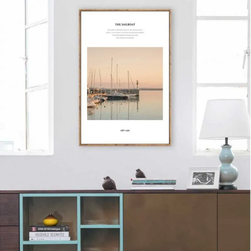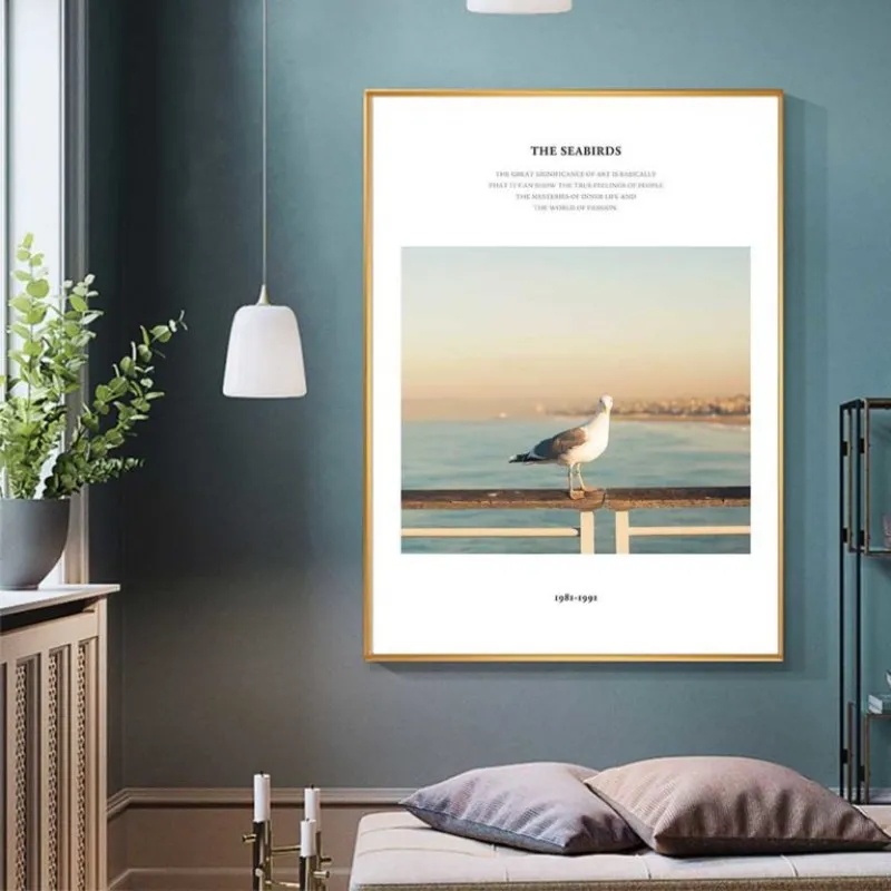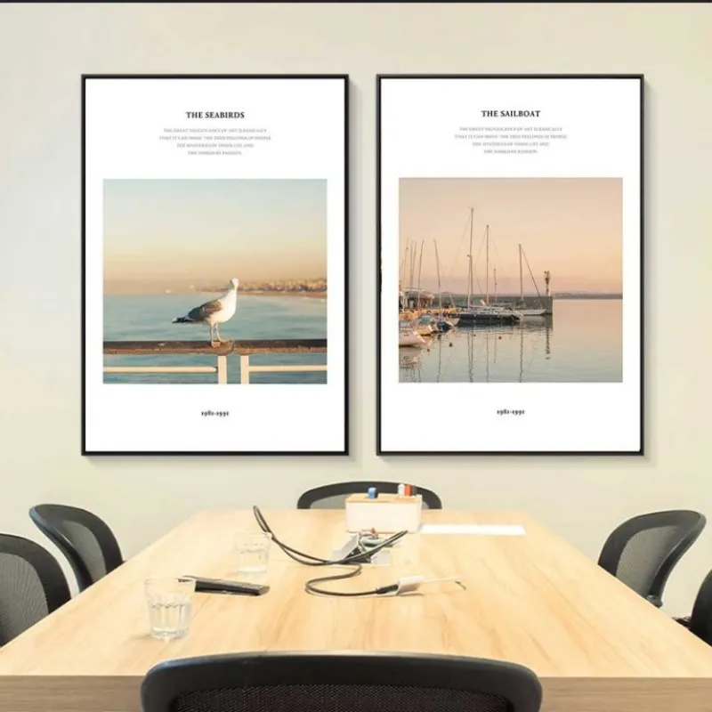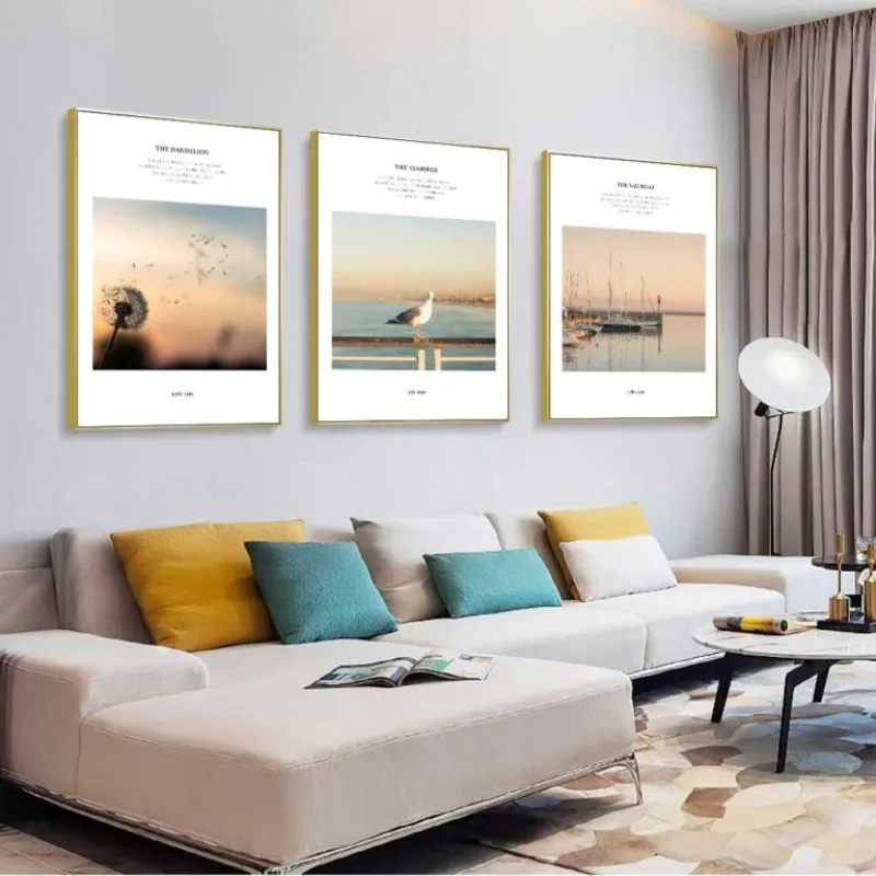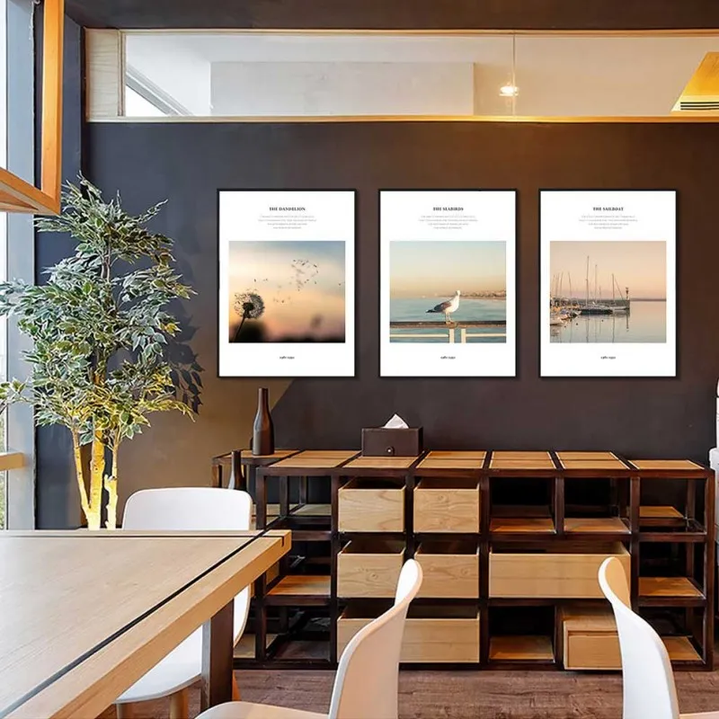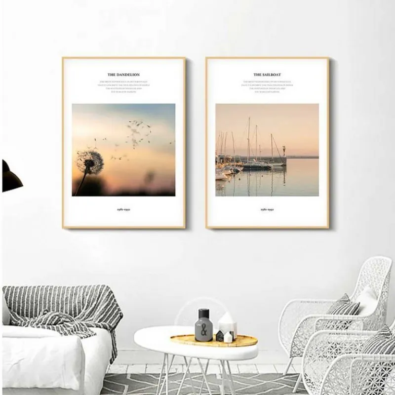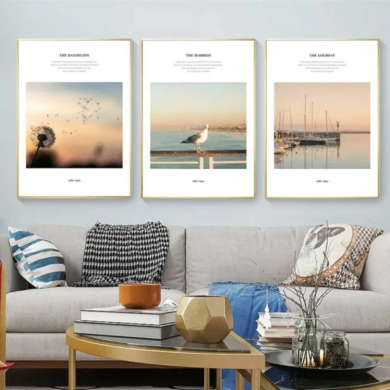 Tranh phong cảnh những chiếc thuyền neo đậu bên bờ sông, hoa bồ công anh bay trong gió, chim hải âu đứng trên bãi biển, tranh kết hợp chữ.