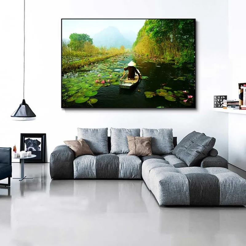Tranh in canvas phong cảnh người phụ nữ đang chèo thuyền trên hồ sen.