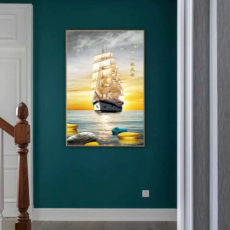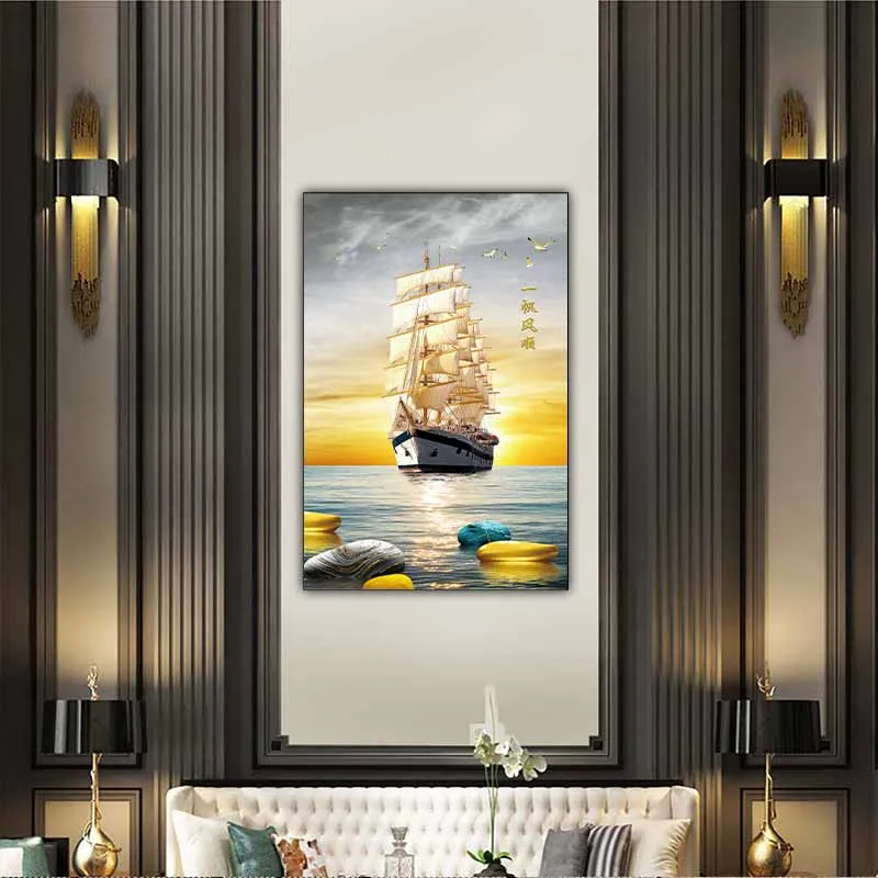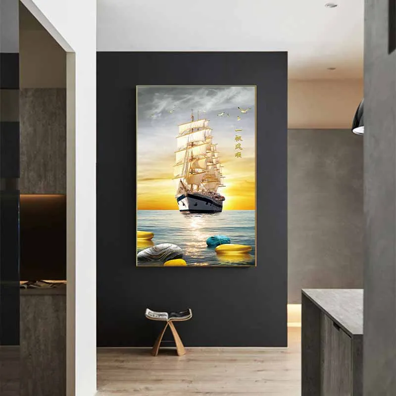 Tranh phong cảnh con thuyền vàng thuận buồm xuôi gió