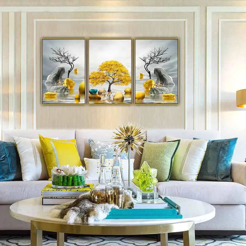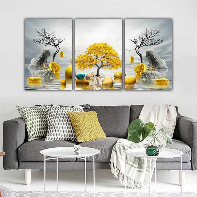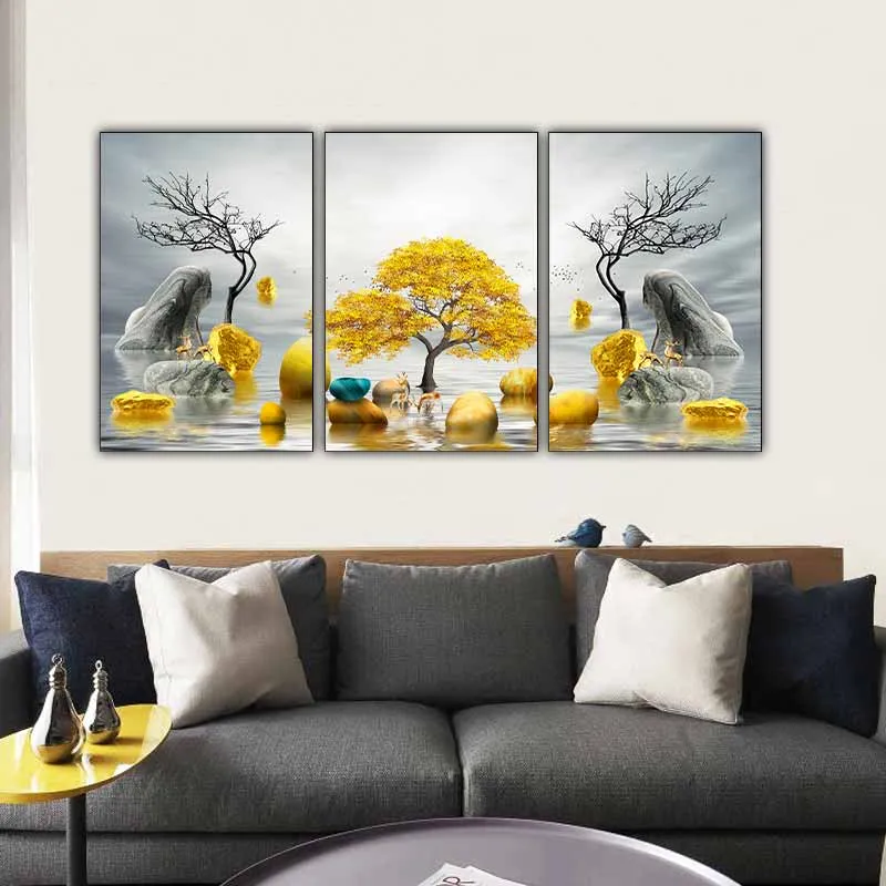 Bức tranh mô tả một phong cảnh với đàn hươu nai đang đứng trên những tảng đá phong thủy trừu tượng. Màu sắc chủ đạo của bức tranh là màu vàng đồng vời nền trắng đen, tạo nên một không gian sang trọng.