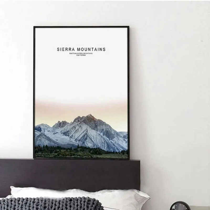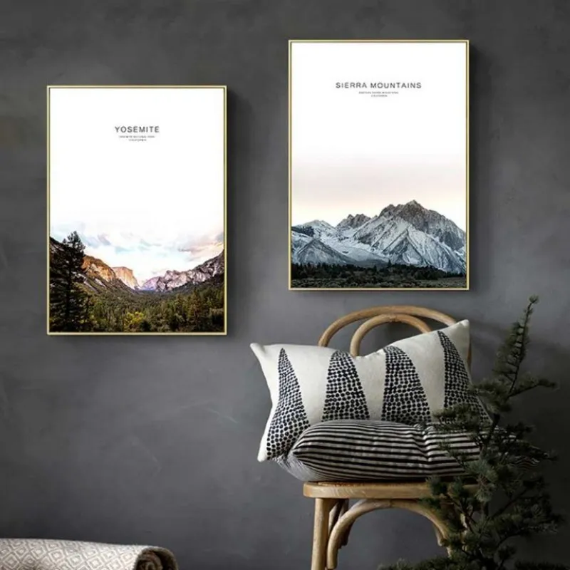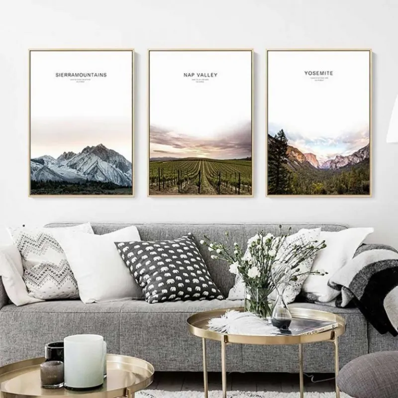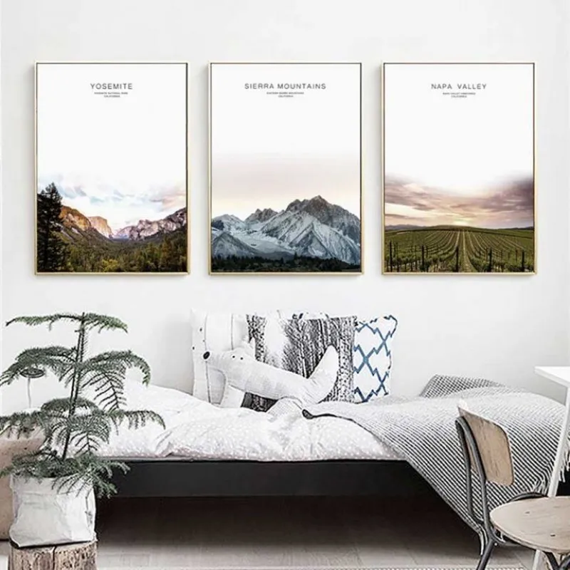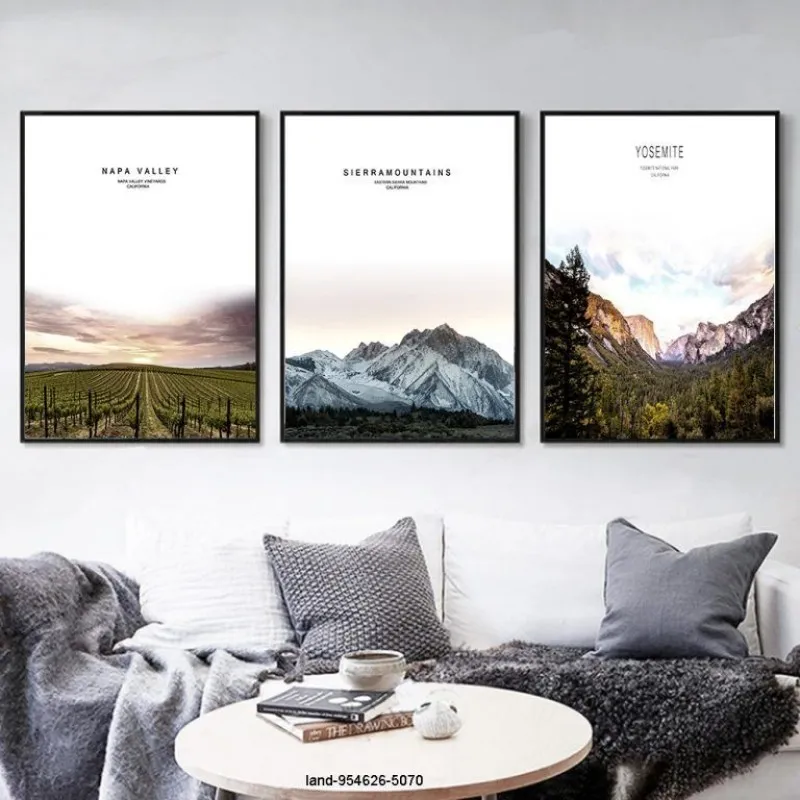 Tranh in canvas phong cảnh thiên nhiên núi tuyết, rừng cây, cánh đồng, kết hợp chữ Yosemite, Yosemite national park California, Sierra mountains, Eastern sierra mountains California, Napa valley, Napa valley vineyards California.