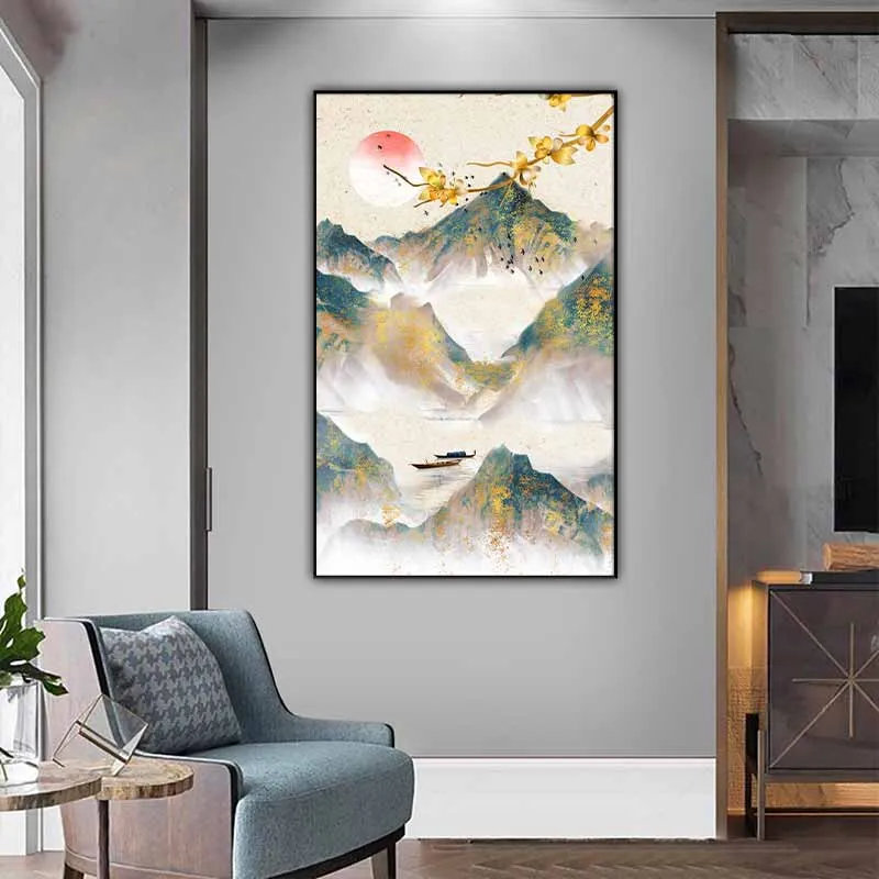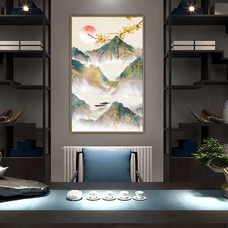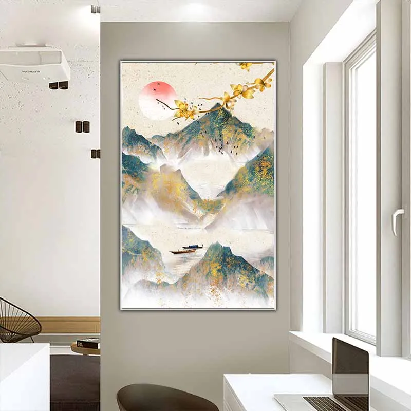 Tranh phong cảnh đồi núi và 2 con thuyền trên dòng sông