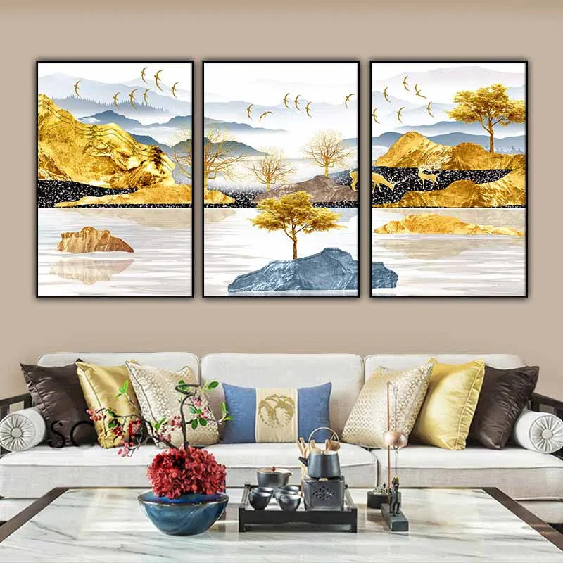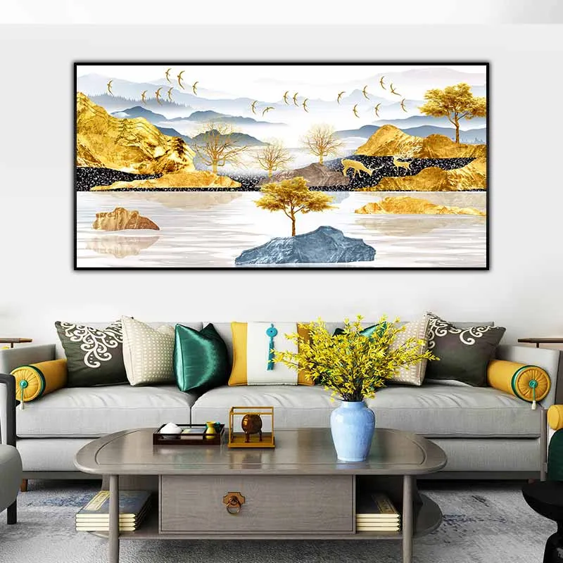 Đồi núi, cây lá vàng và hình ảnh hai con nai mang đến năng lượng của sự ổn định và tài lộc. Theo phong thủy, màu vàng được xem là màu của sự sung túc, giàu có và sự thịnh vượng. Vì vậy, bức tranh này có thể giúp tăng cường năng lượng của căn phòng, tạo ra sự cân bằng, thăng hoa và thu hút tài lộc.